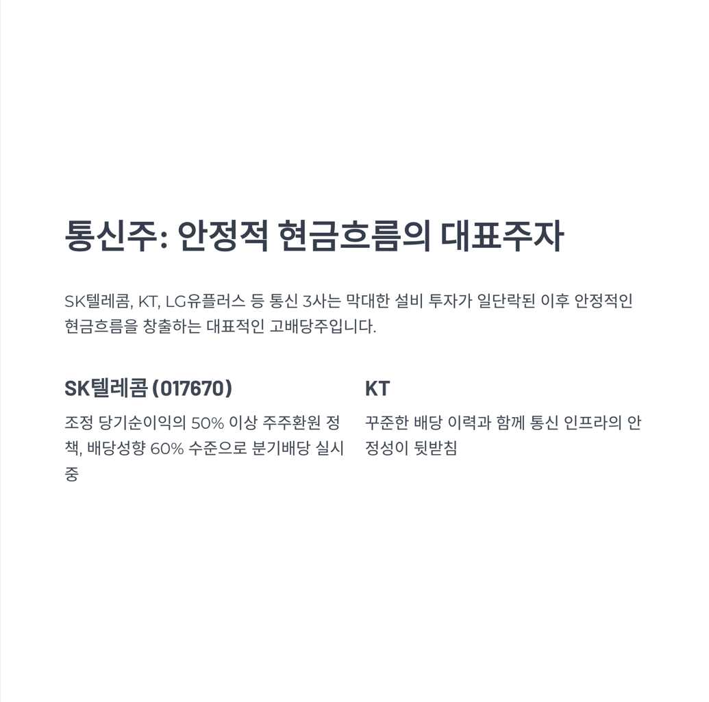 SK텔레콤, KT, LG유플러스 등 통신 3사는 막대한 설비 투자가 일단락된 이후 안정적인 현금흐름을 창출하는 대표적인 고배당주입니다.