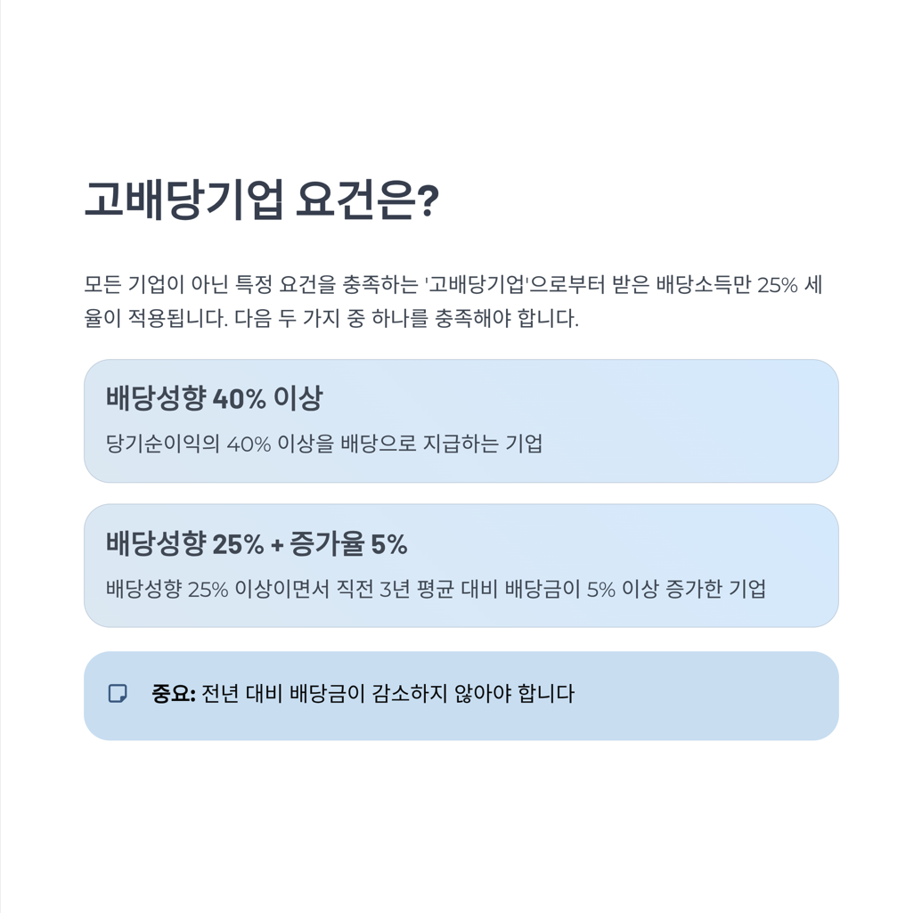 하지만 2025년 세제개편안이 통과되면 상황이 완전히 달라집니다. 특정 요건을 충족하는 '고배당기업'으로부터 받은 배당소득은 다른 소득과 합산하지 않고 별도로 과세하되, 최고세율을 25%로 낮춘다는 것이 핵심입니다. 지방소득세를 포함해도 27.5%에 불과합니다.