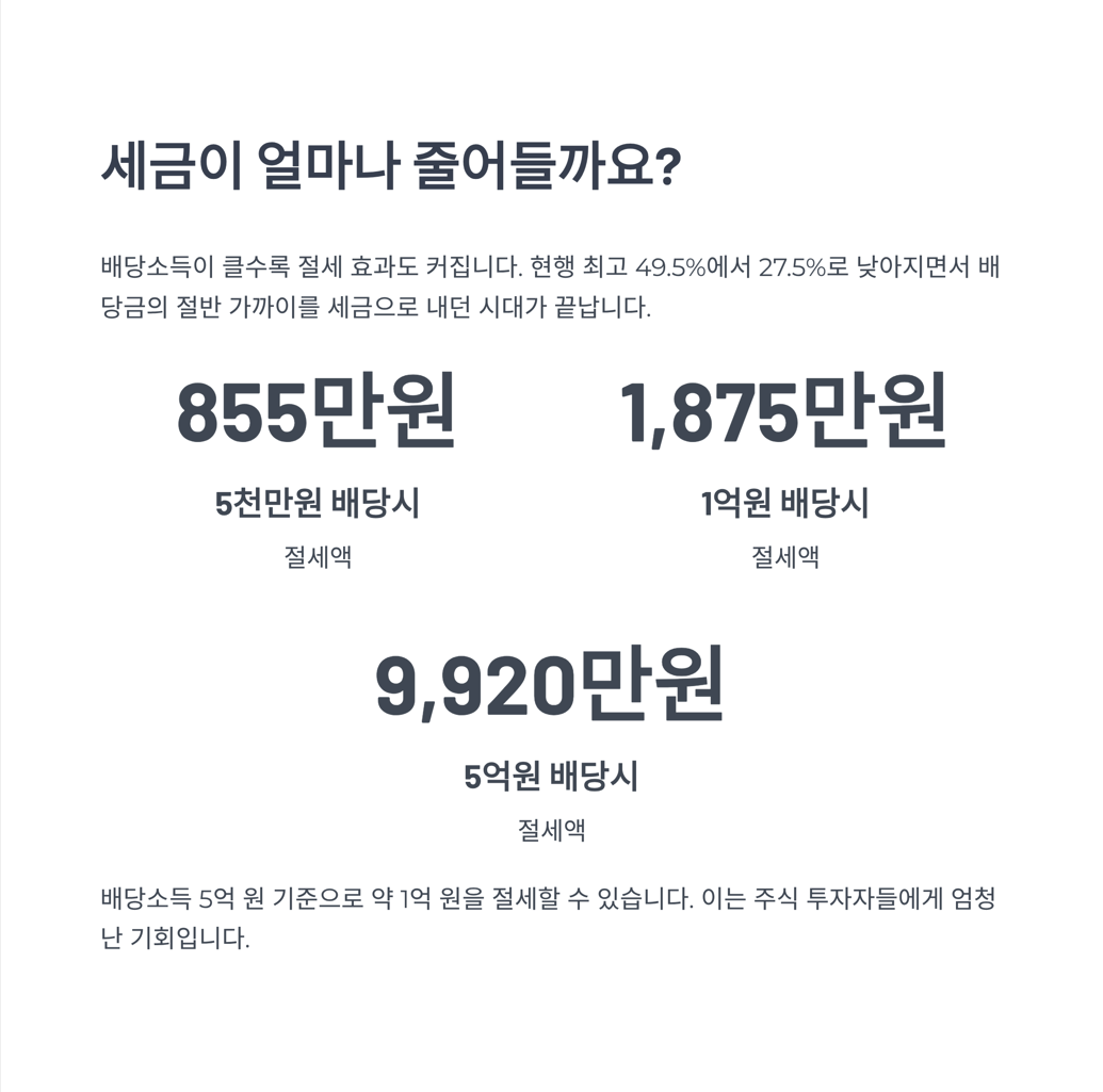 위 표에서 보시는 것처럼 배당소득이 클수록 절세 효과도 커집니다. 배당소득 5억 원 기준으로 약 1억 원을 절세할 수 있다는 계산이 나옵니다. 이는 주식 투자자들에게 엄청난 기회입니다.