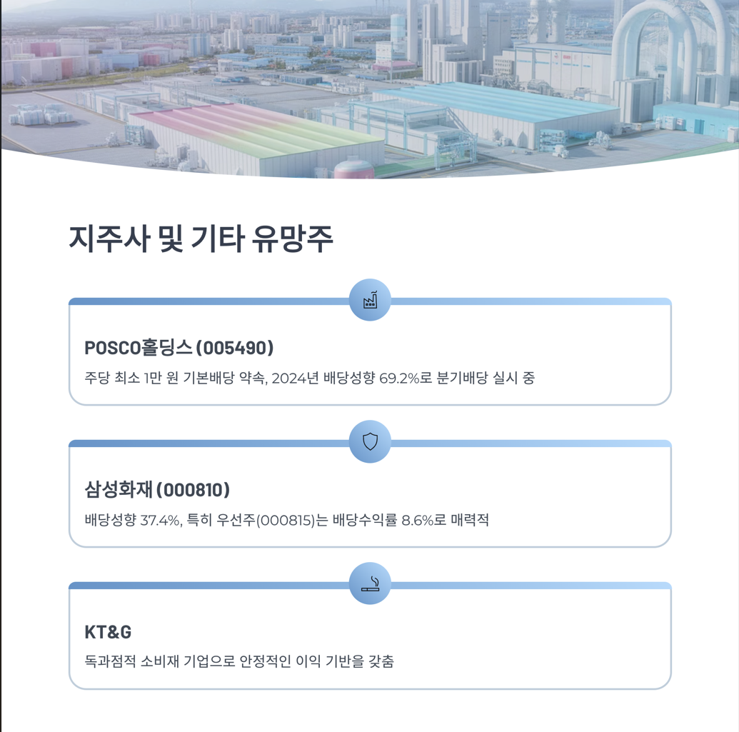 - POSCO홀딩스(005490) - 주당 최소 1만 원 기본배당 약속, 2024년 배당성향 69.2%로 분기배당 실시 중입니다