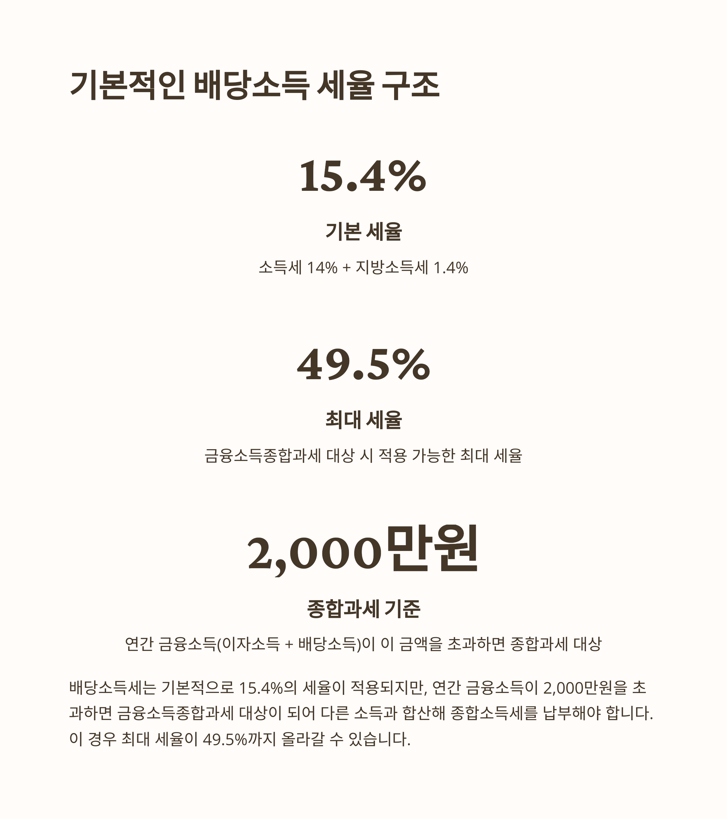 - 2,000만원 초과 배당소득은 다른 소득과 합산해 종합소득세 세율(최대 49.5%) 적용