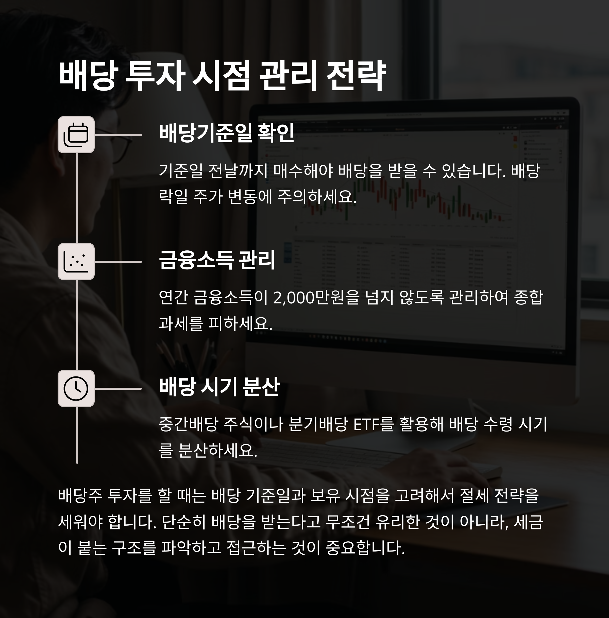 | 배당기준일 확인 | 기준일 전날까지 매수해야 배당 수령 | 배당락일 주가 변동 주의 |