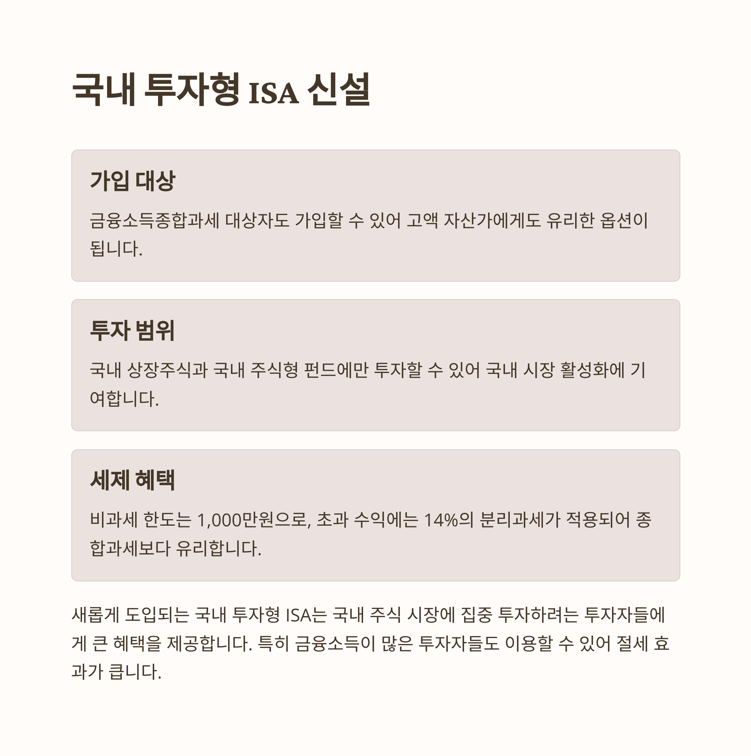새롭게 도입되는 국내 투자형 ISA는 금융소득종합과세 대상자도 가입할 수 있으며, 국내 상장주식과 국내 주식형 펀드에만 투자할 수 있습니다. 이 계좌의 비과세 한도는 1,000만원으로, 초과 수익에는 14%의 분리과세가 적용됩니다.