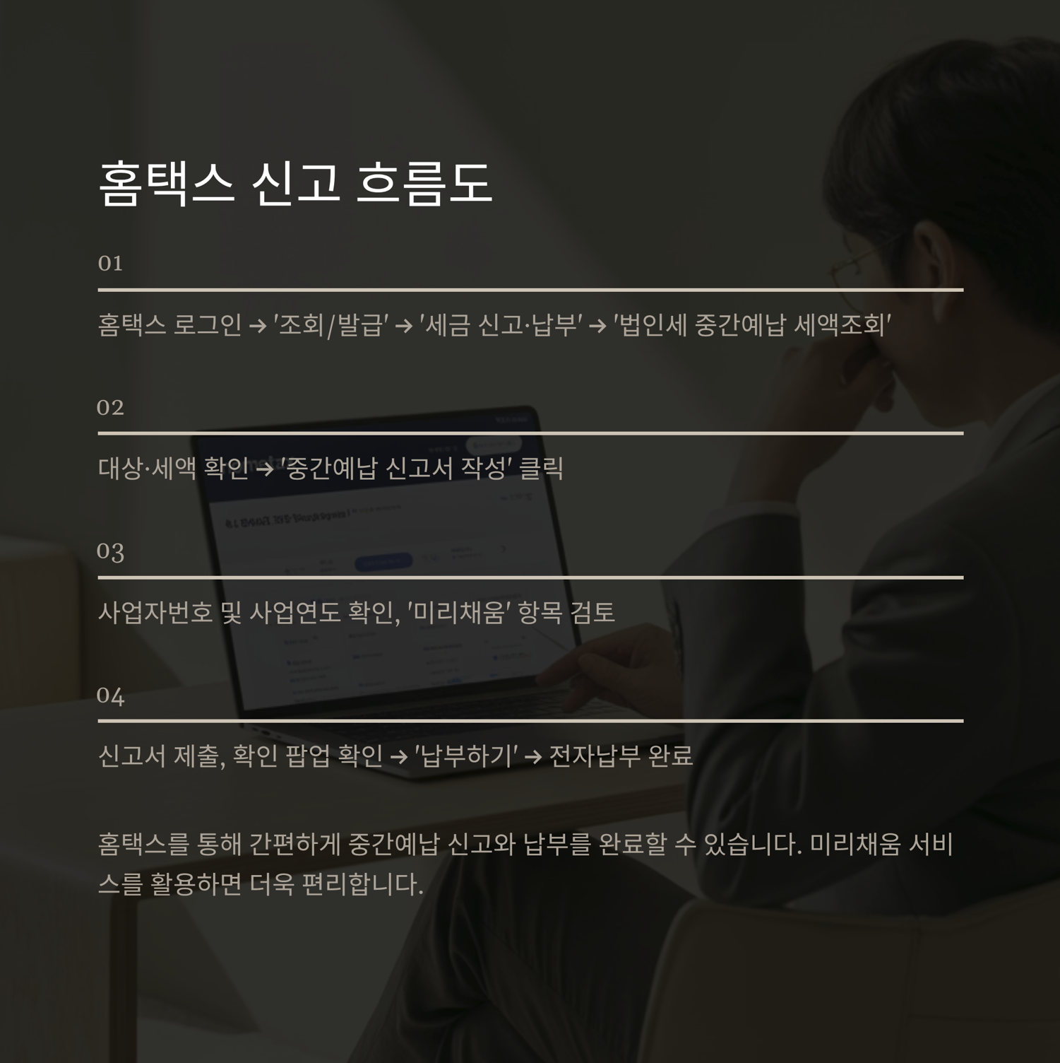 A: 홈택스 '중간예납 세액조회' 메뉴에서 자동 확인됩니다.