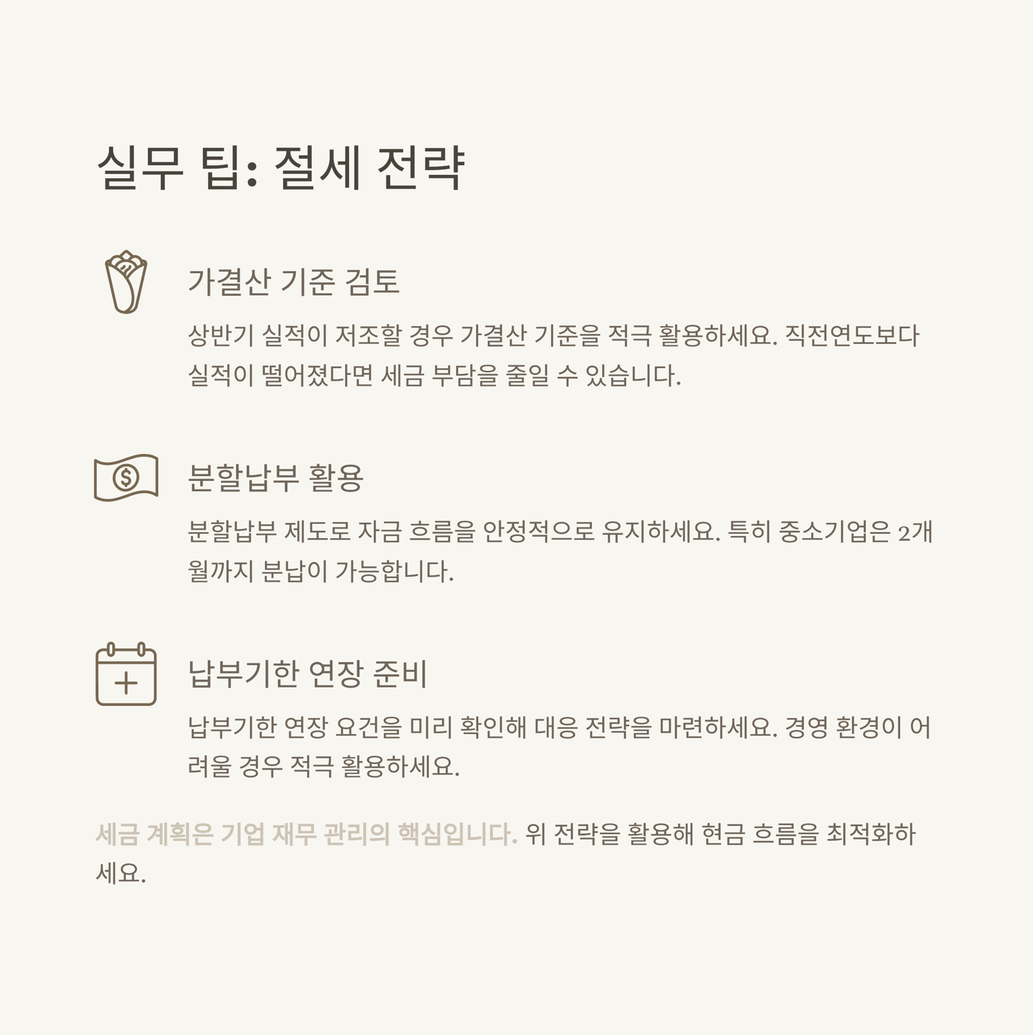 - 가결산 기준: 1~6월 실적에 따라 계산하여 세액 산출 — 실적이 부진한 경우 유리한 방식