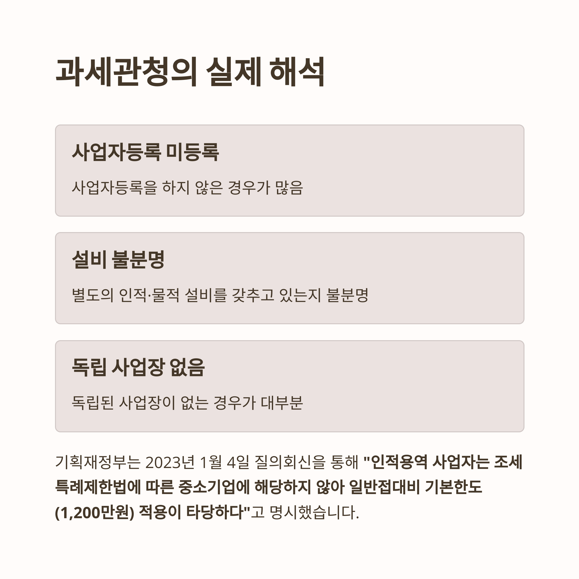 과세관청은 인적용역사업자를 중소기업으로 인정하지 않습니다. 그 이유는 다음과 같습니다: