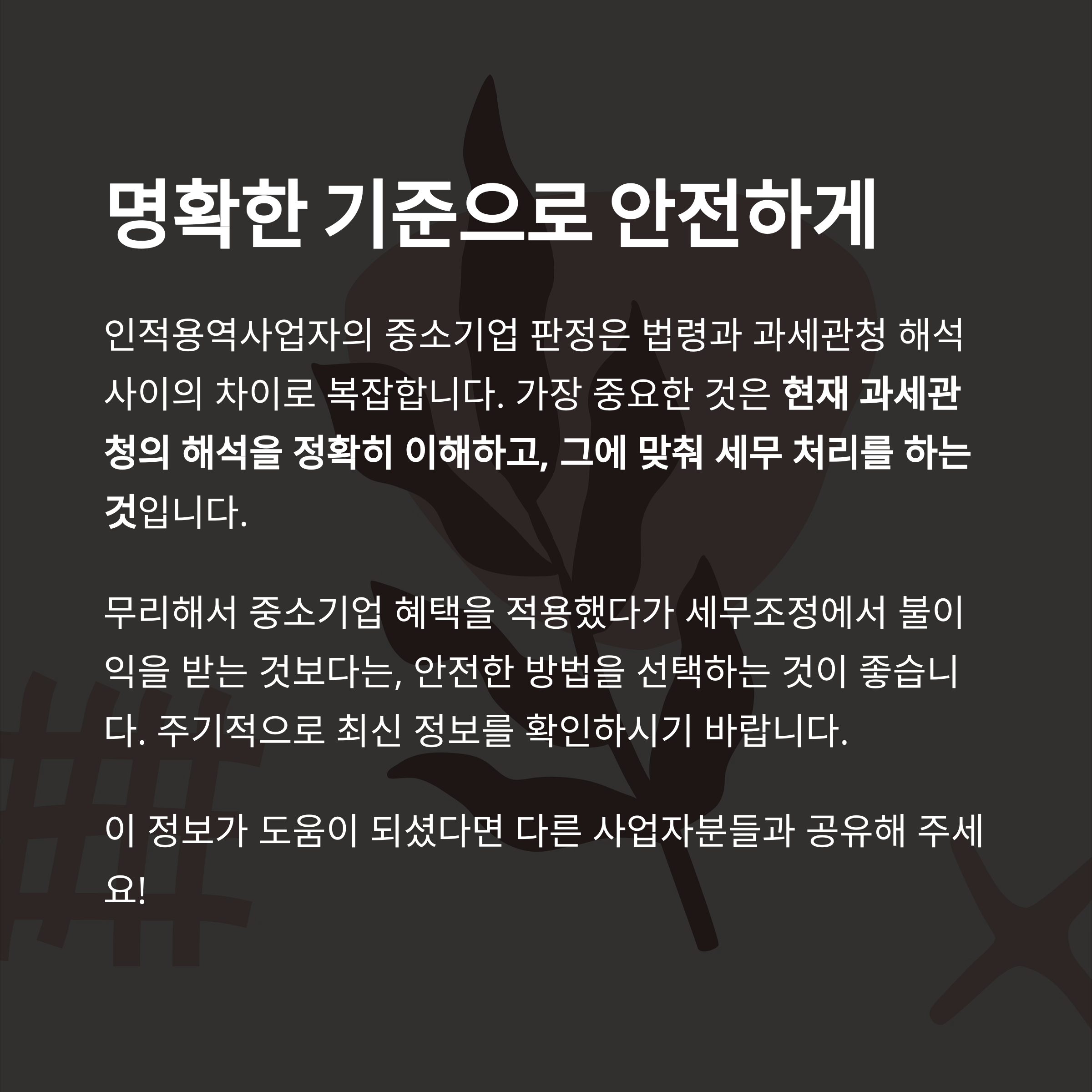 가장 중요한 것은 현재 과세관청의 해석을 정확히 이해하고, 그에 맞춰 세무 처리를 하는 것입니다. 무리해서 중소기업 혜택을 적용했다가 나중에 세무조정에서 불이익을 받는 것보다는, 안전한 방법을 선택하는 것이 좋겠죠.
