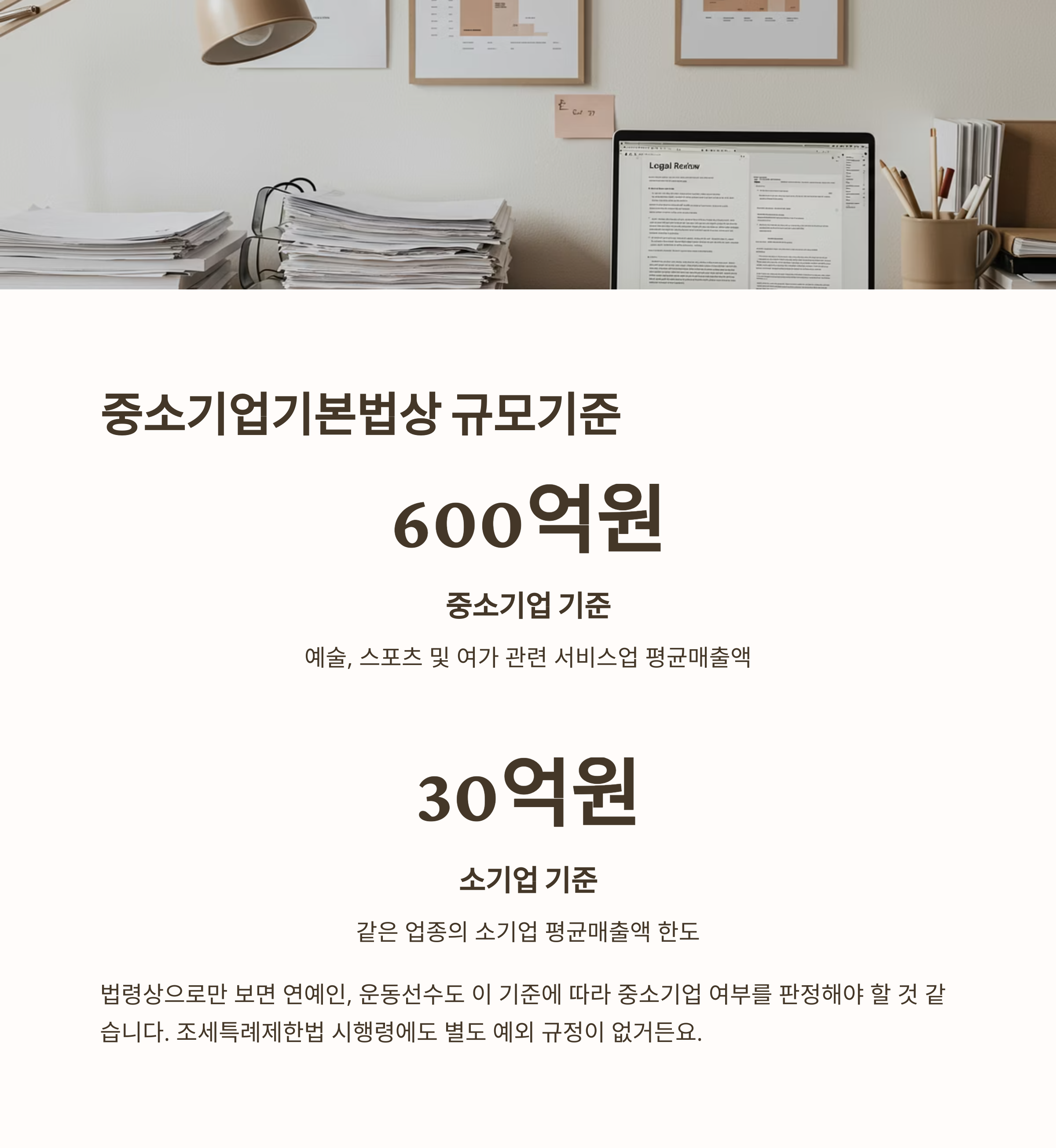 법령상으로만 보면 연예인, 운동선수 등도 이 기준에 따라 중소기업 여부를 판정해야 할 것 같습니다. 실제로 조세특례제한법 시행령 제2조에서는 소비성서비스업을 제외한 모든 업종에서 중소기업기본법의 규모기준을 적용하도록 하고 있고, 연예인이나 운동선수를 제외한다는 별도의 예외 규정도 없거든요.