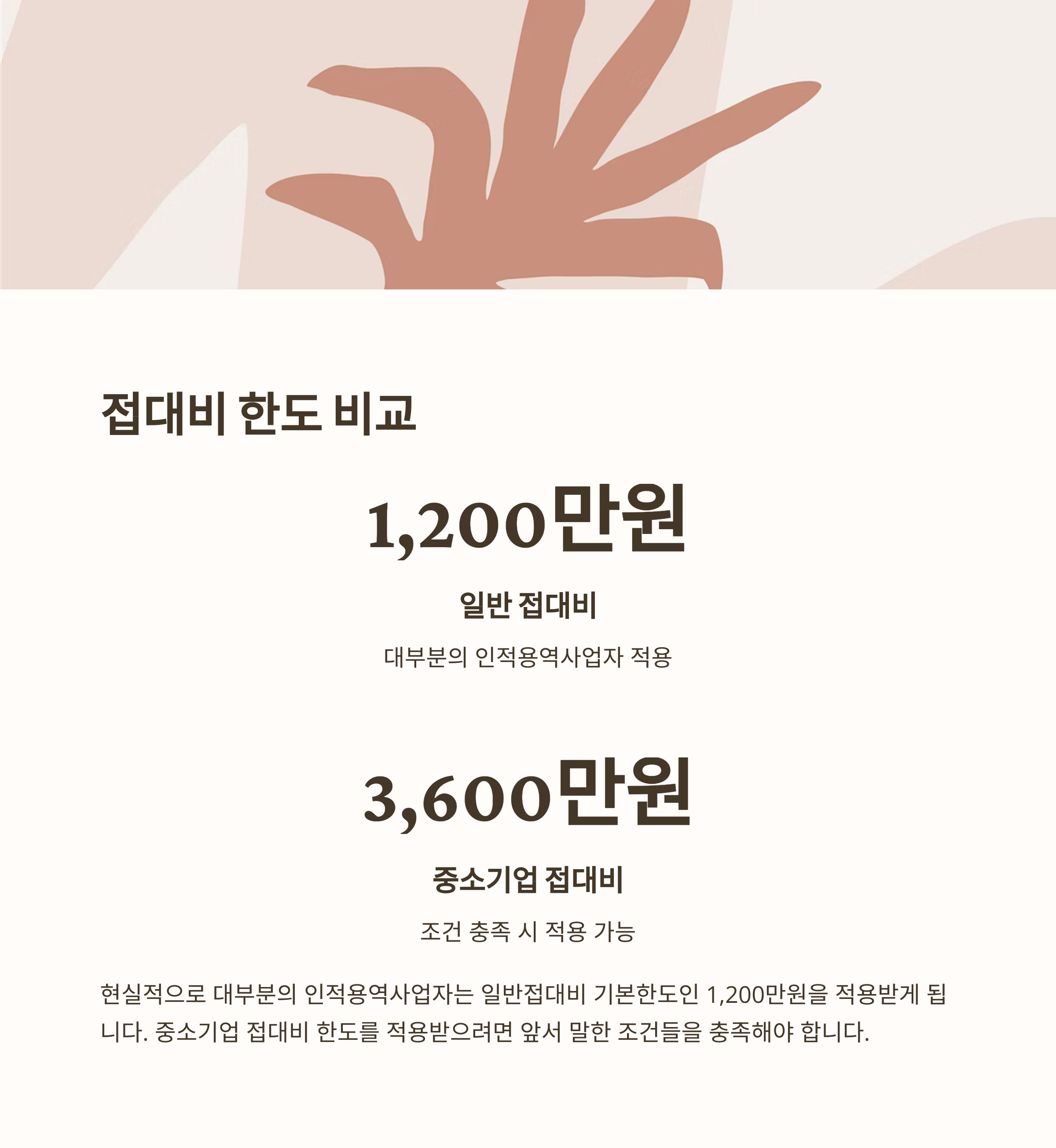 현실적으로 대부분의 인적용역사업자는 일반접대비 기본한도인 1,200만원을 적용받게 됩니다. 중소기업 접대비 한도인 3,600만원을 적용받기 위해서는 앞서 말한 조건들을 충족해야 합니다.