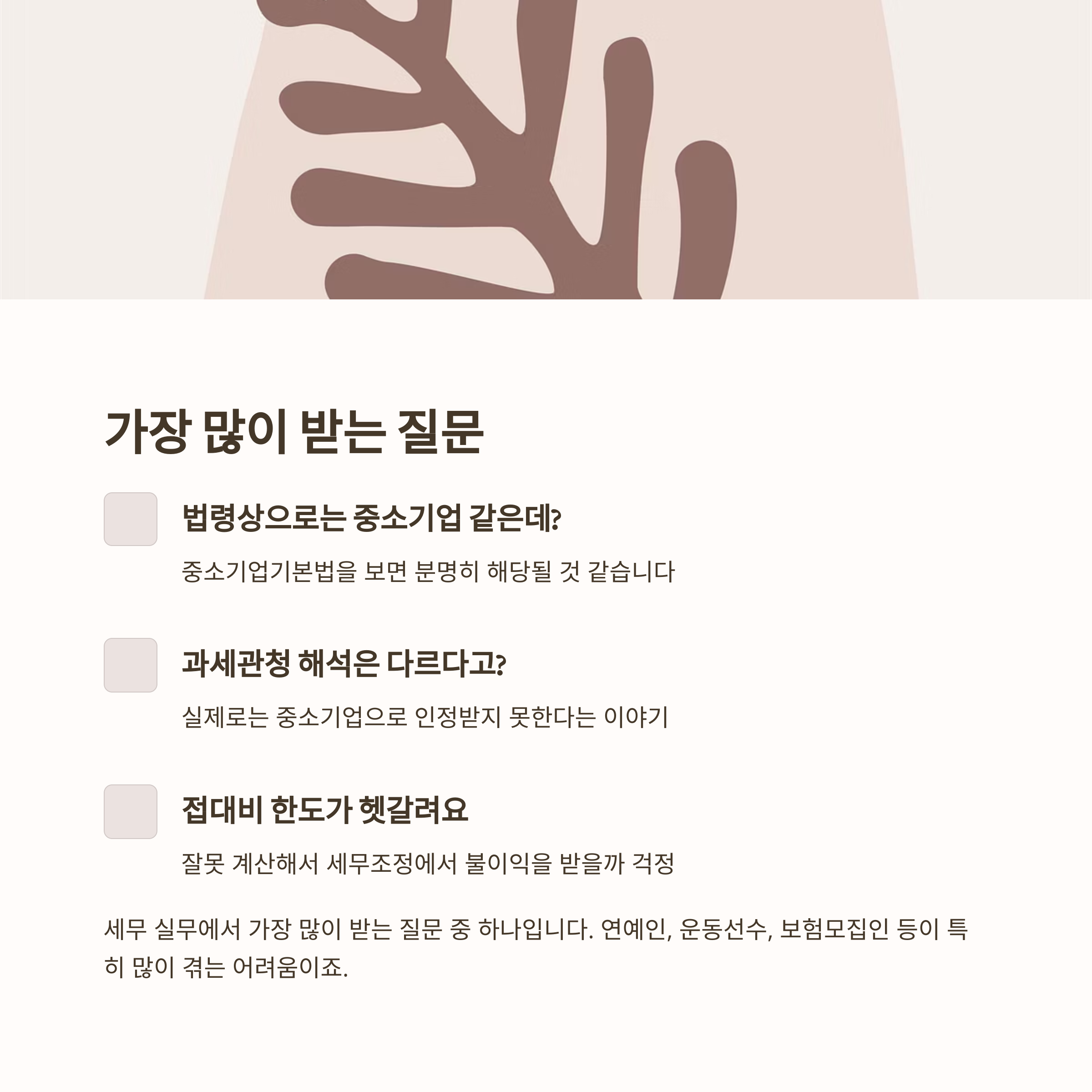 이런 애매한 상황 때문에 접대비 한도를 잘못 계산해서 세무조정에서 불이익을 받거나, 중소기업 특례를 놓치는 경우도 종종 발생합니다. 특히 연예인, 운동선수, 보험모집인 등 인적용역사업자분들이 가장 많이 겪는 어려움이죠.