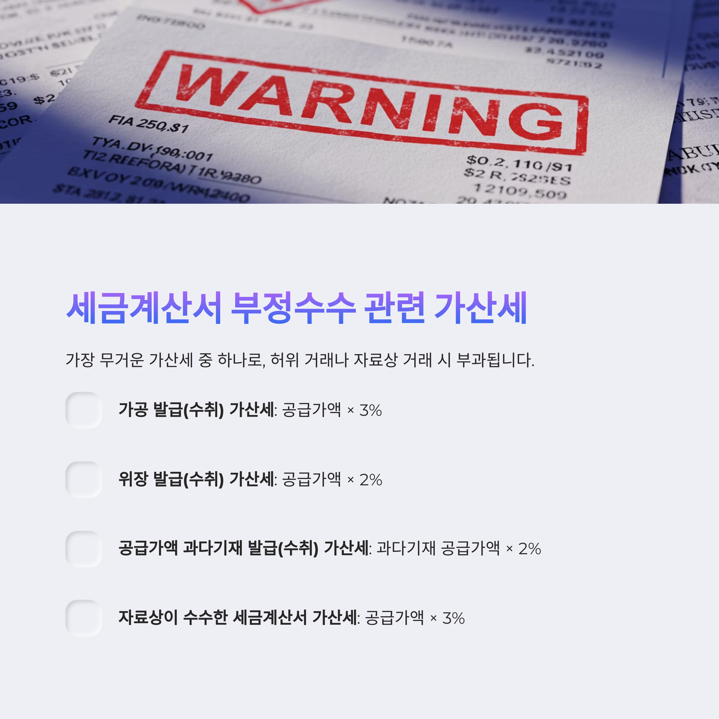가장 무거운 가산세 중 하나로, 허위 거래나 자료상 거래 시 부과됩니다.