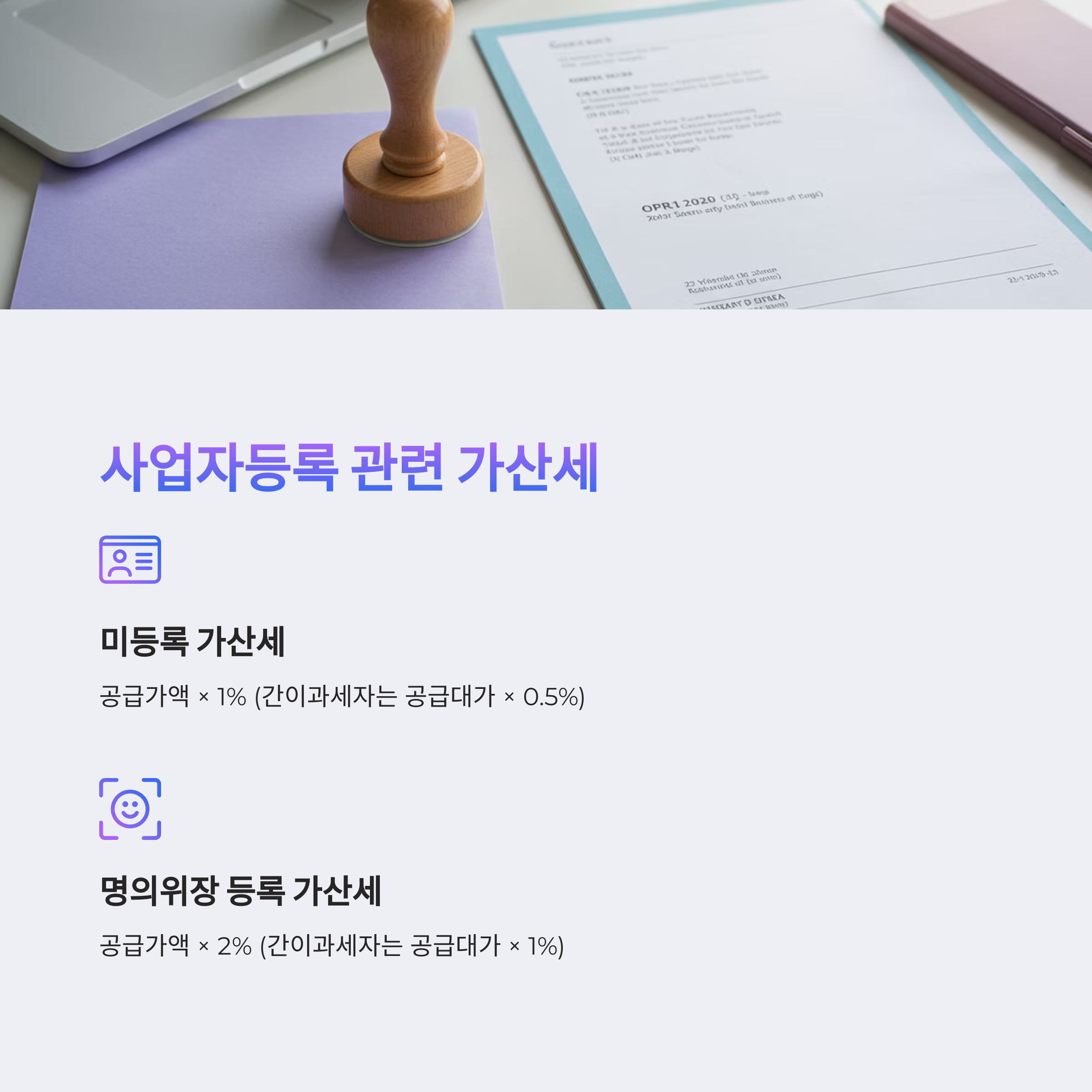• 명의위장 등록 가산세: 공급가액 × 2% (간이과세자는 공급대가 × 1%)