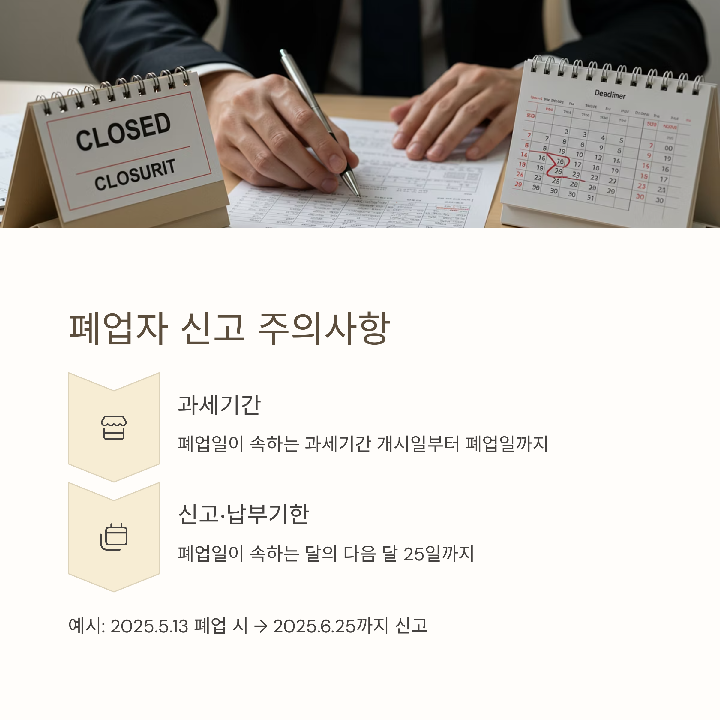 - 신고·납부기간: 폐업일이 속하는 달의 다음 달 25일까지