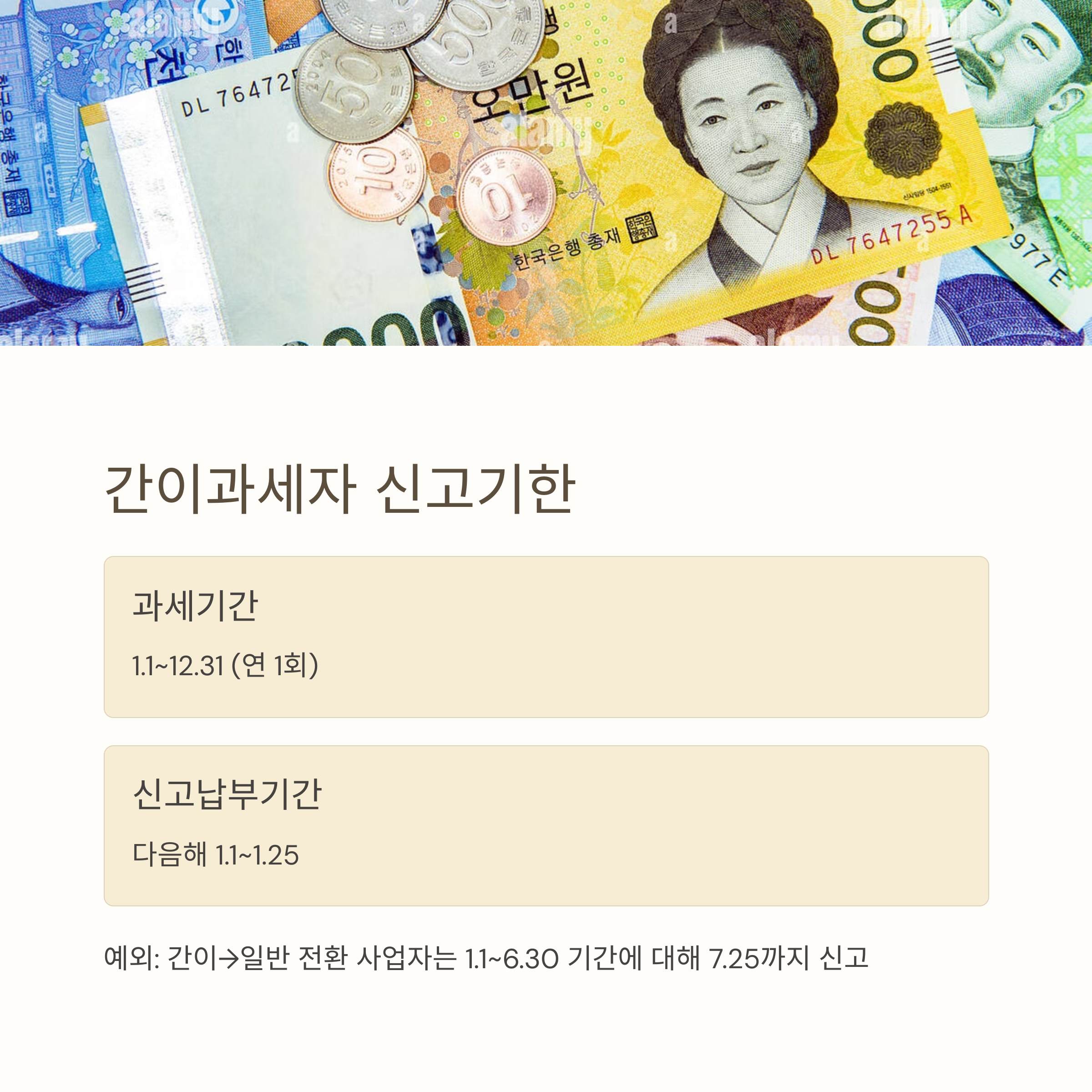 예외사항: 7월 1일 기준 간이→일반 전환 사업자와 예정부과기간(1.1~6.30)에 세금계산서를 발급한 간이과세자는 1.1~6.30을 과세기간으로 하여 7.25까지 신고·납부