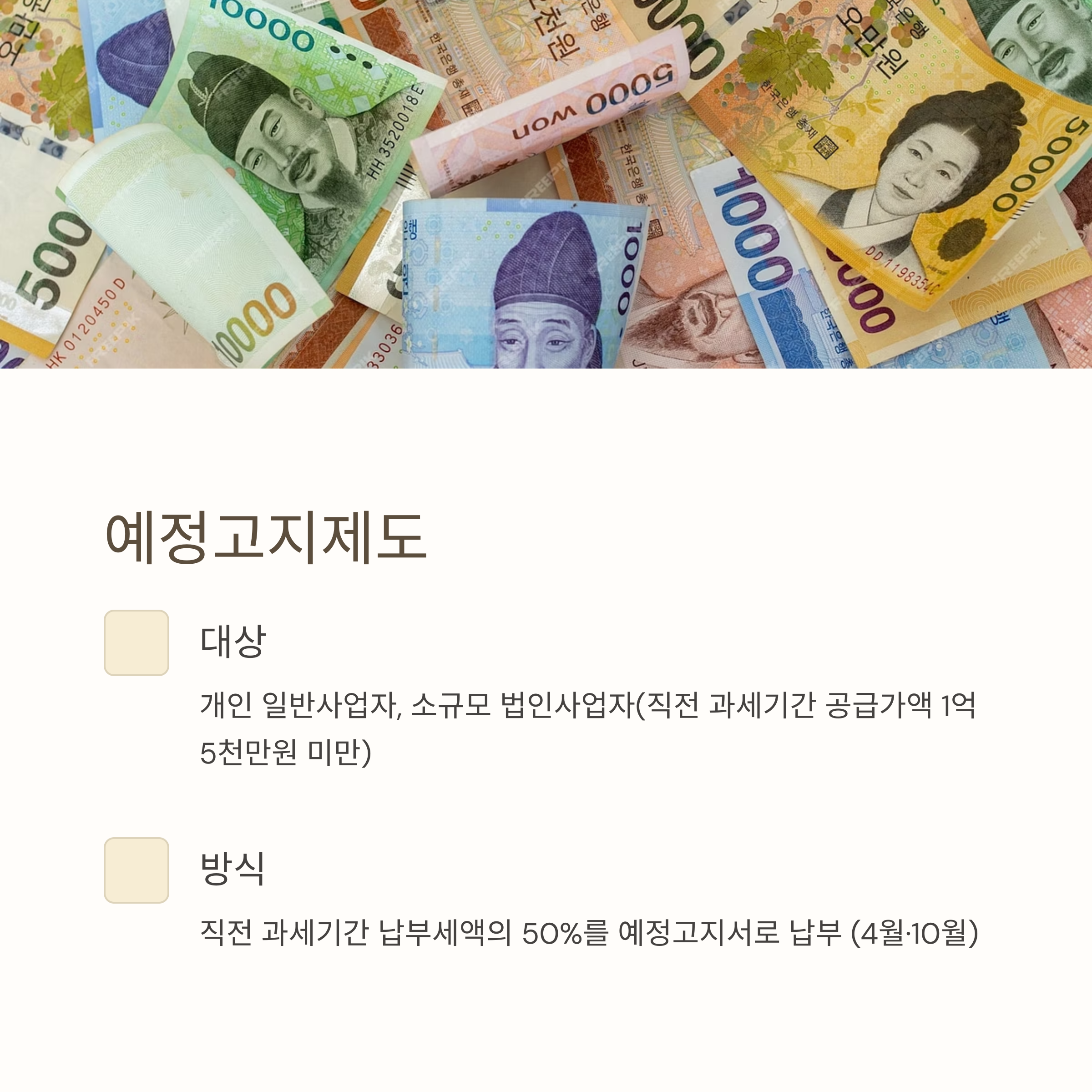 - 예정고지 제외대상: 징수금액이 50만원 미만이거나 간이→일반 과세유형 전환 사업자