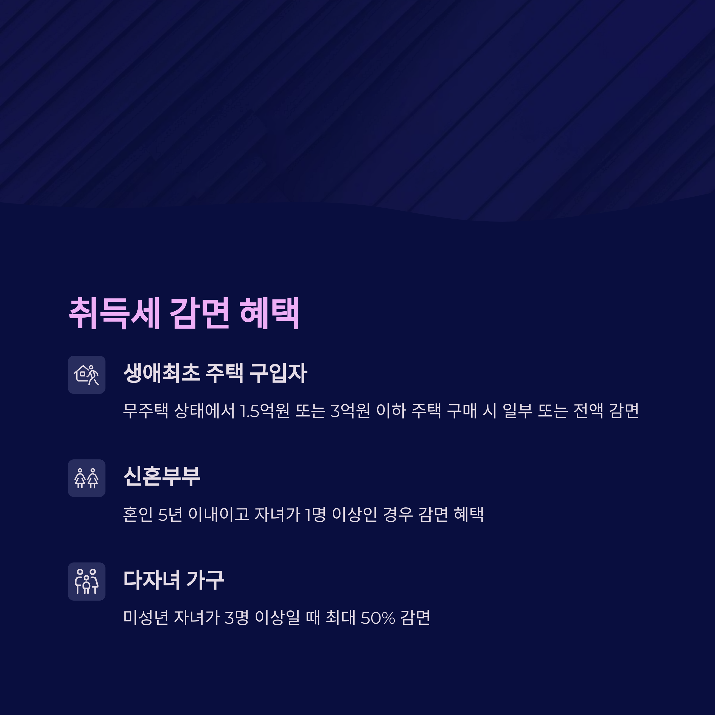 - 생애최초 주택 구입자: 무주택 상태에서 1.5억원 또는 3억원 이하 주택 구매 시 일부 또는 전액 감면