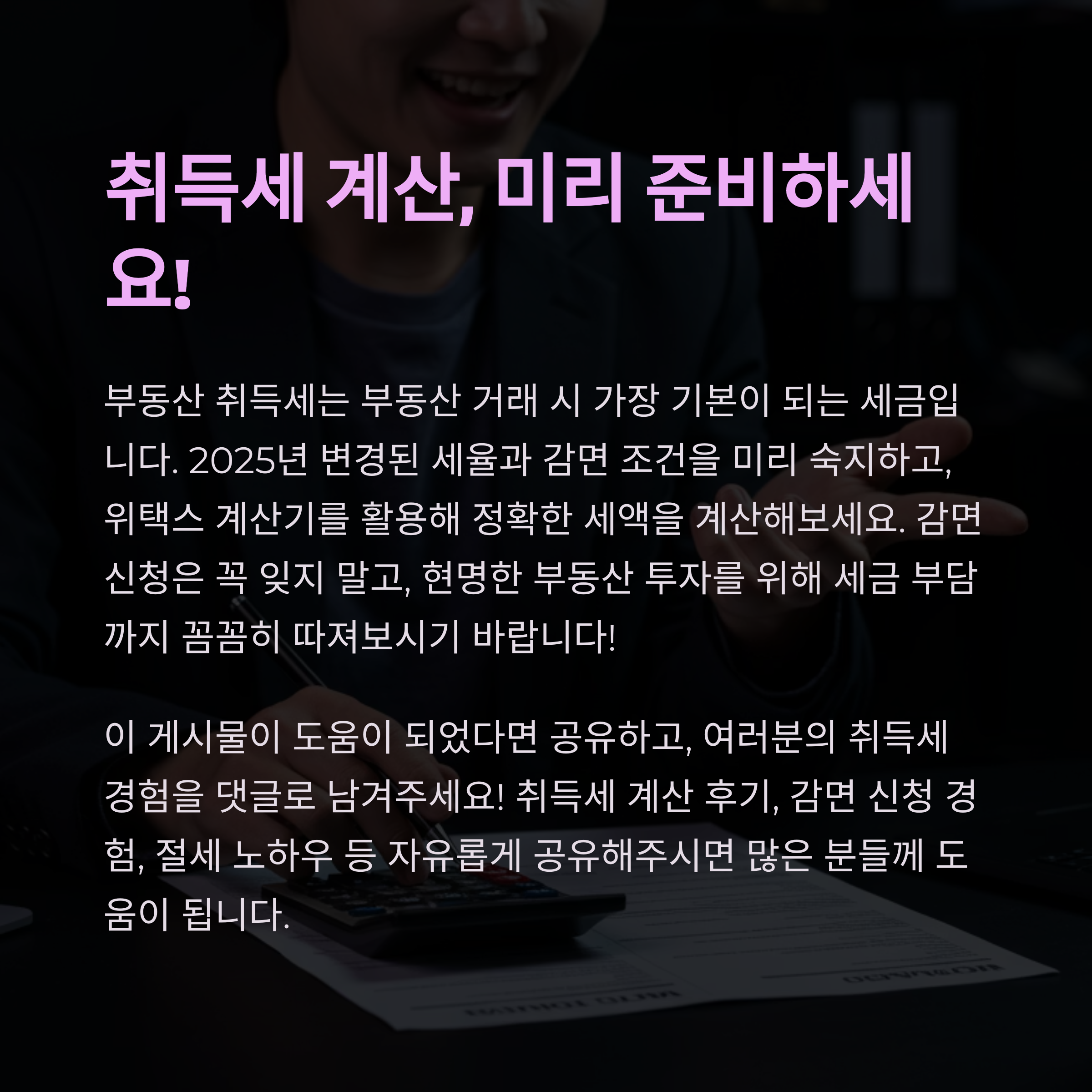 취득세 계산 후기, 감면 신청 경험, 절세 노하우 등 자유롭게 남겨주시면 많은 분들께 도움이 됩니다. 공감 버튼도 꼭 눌러주세요!