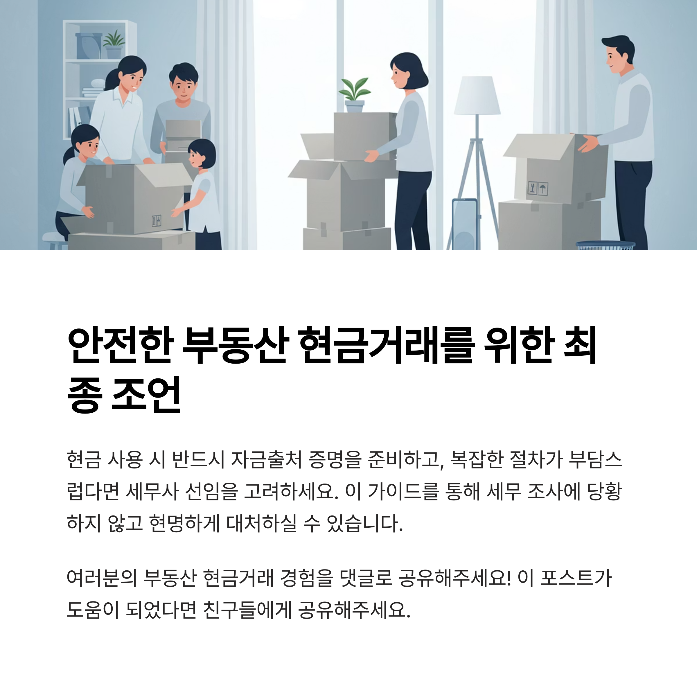 현금거래 후기, 세무조사 경험, 자금출처 증명 팁 등 자유롭게 남겨주시면 많은 분들께 도움이 됩니다. 공감 버튼도 꼭 눌러주세요!