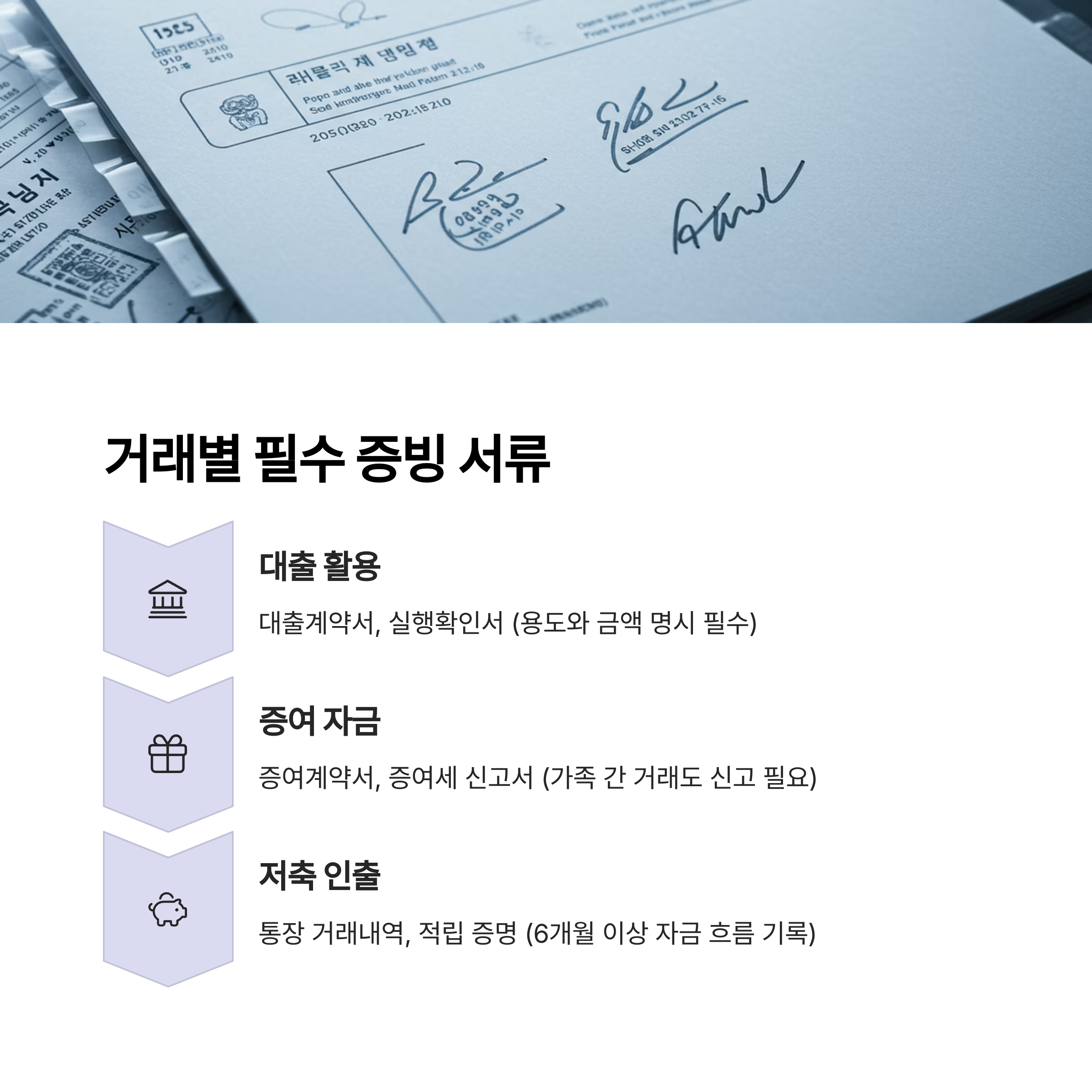 | 증여 자금 | 증여계약서, 증여세 신고서 | 가족 간 거래도 신고 필요 |