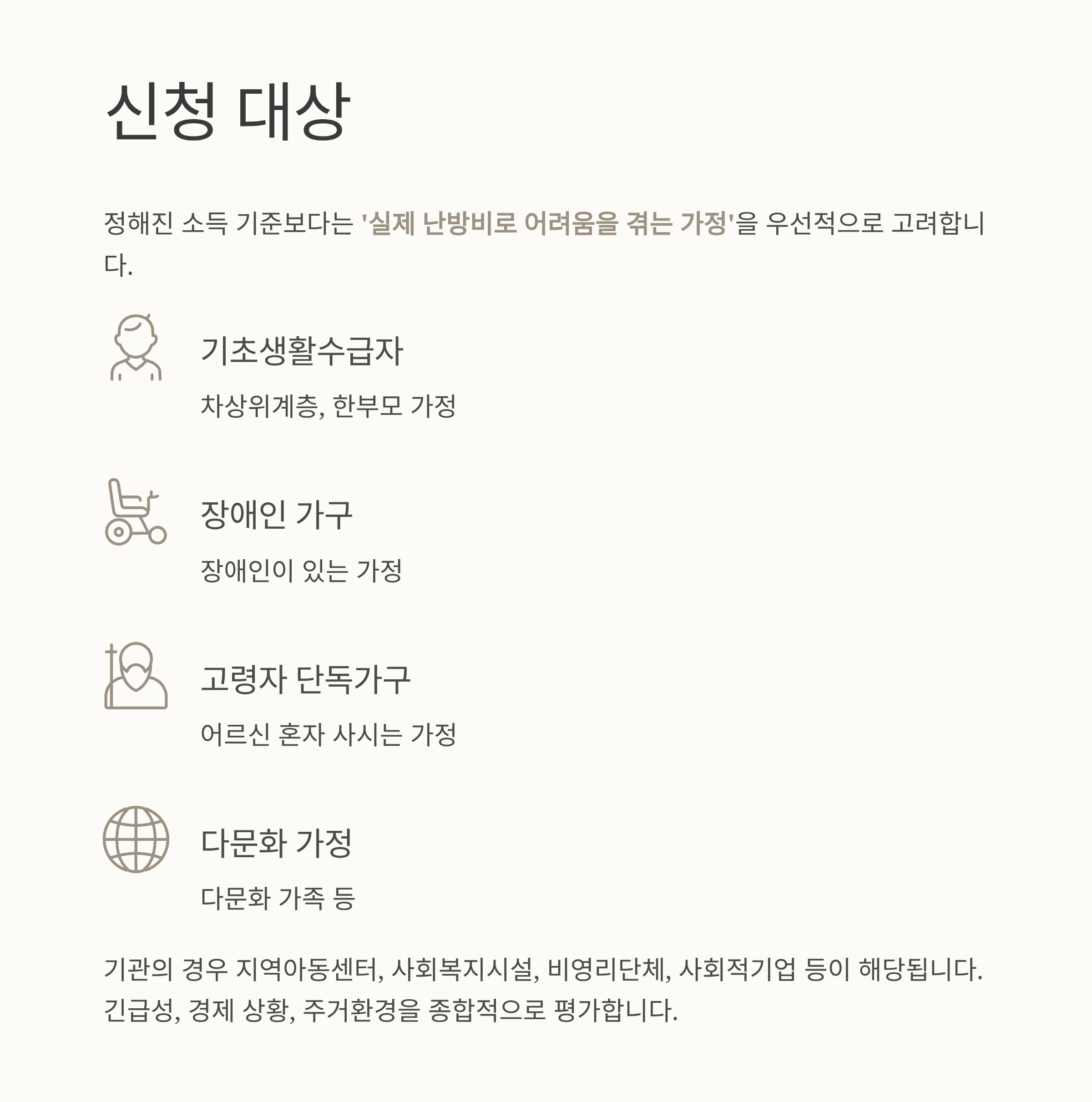 사랑온 난방비는 정해진 소득 기준보다는 '실제 난방비로 어려움을 겪는 가정'을 우선적으로 고려합니다. 대표적인 신청 가능 대상은 다음과 같습니다.