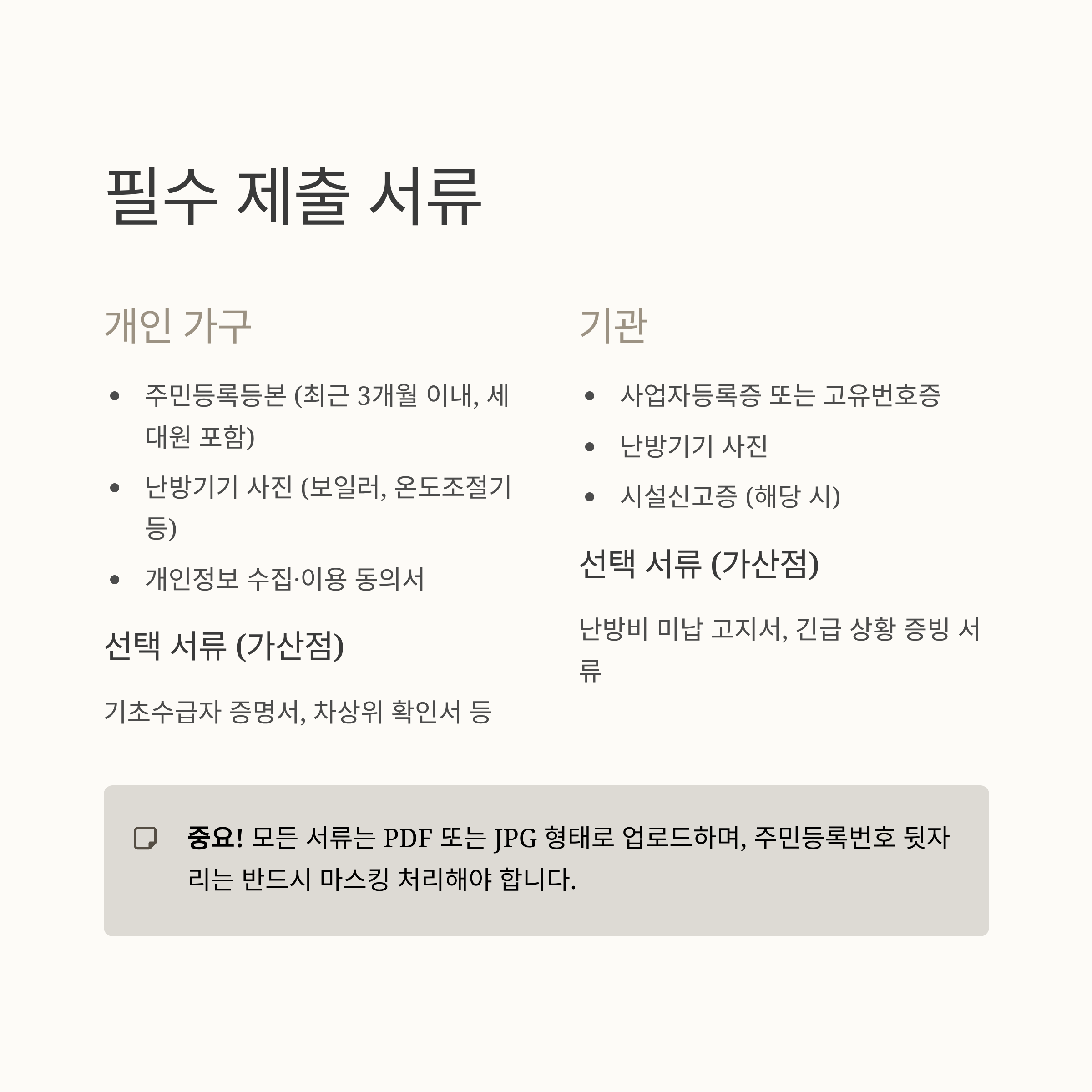 사랑온 난방비 신청 시 필요한 서류는 신청자 유형(개인/기관)에 따라 다릅니다.