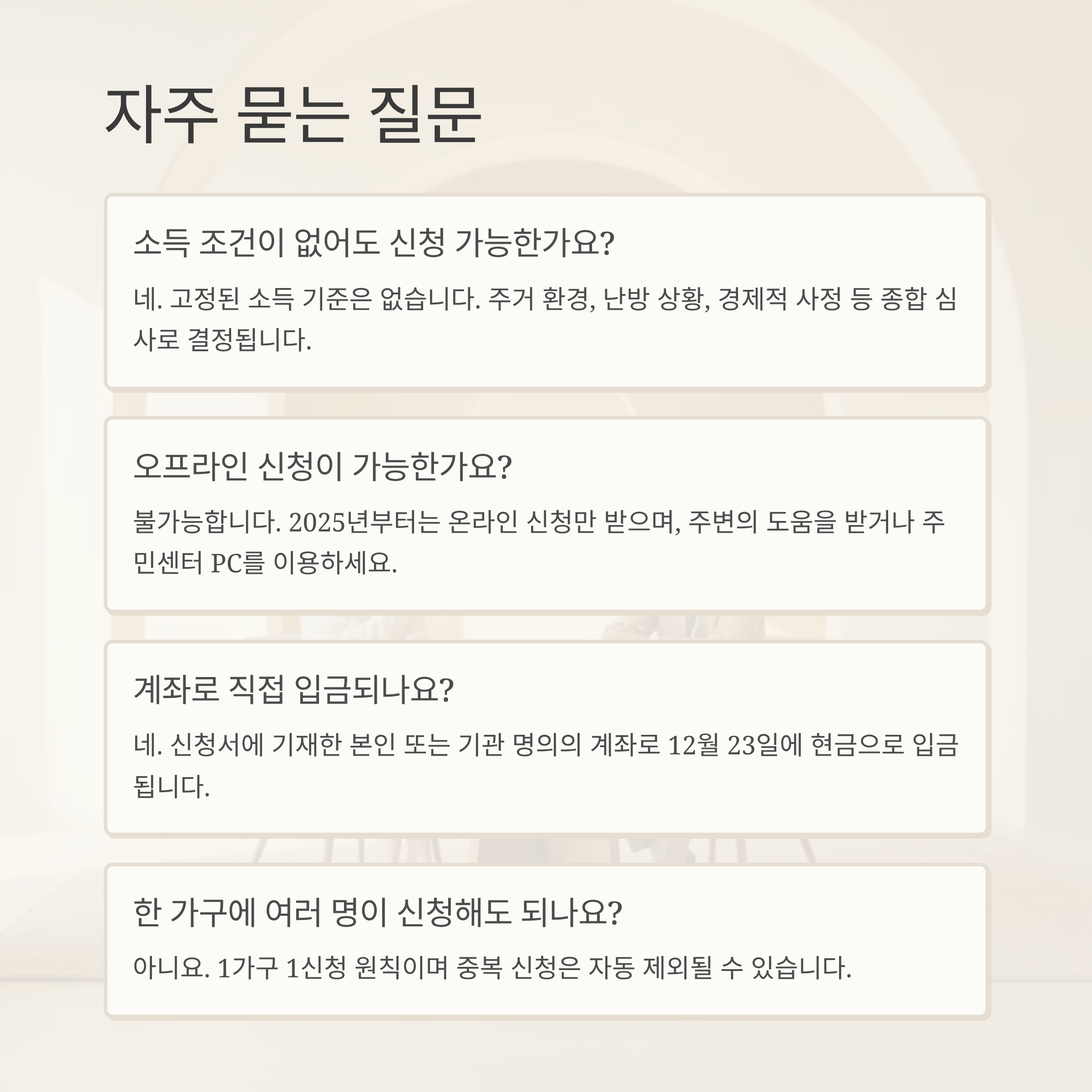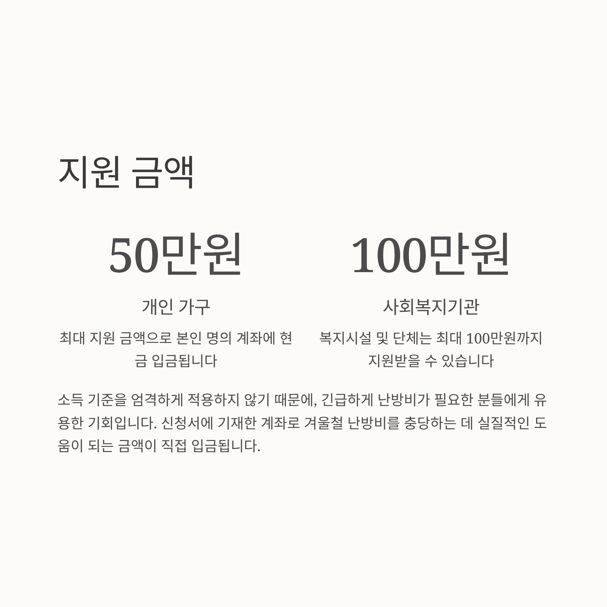 이 금액은 신청서에 기재한 본인 명의 계좌로 현금 입금되며, 겨울철 난방비를 충당하는 데 실질적인 도움이 됩니다. 특히 개인 신청자의 경우 소득 기준을 엄격하게 적용하지 않기 때문에, 긴급하게 난방비가 필요한 분들에게 유용한 기회가 될 수 있습니다.