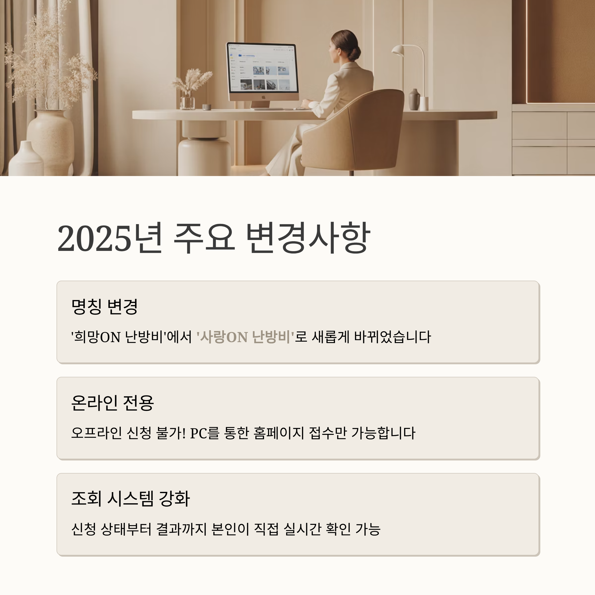 2025년부터 기존의 ‘희망ON 난방비’에서 ‘사랑ON 난방비’로 명칭이 바뀌었습니다. 그리고 가장 큰 변화는 온라인 접수만 가능하다는 점입니다. 오프라인 신청은 받지 않기 때문에 PC를 통해 홈페이지에서 회원가입 후 신청서를 작성해야 합니다. 또한 신청 접수 이후에는 본인이 직접 신청 상태를 조회하고 결과까지 확인할 수 있는 조회 시스템이 강화되어 편의성이 높아졌습니다.