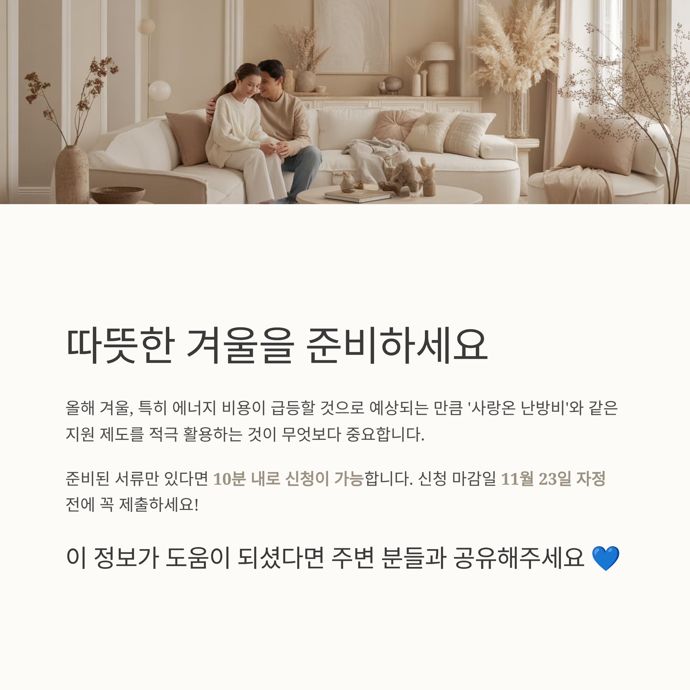 겨울철 난방비 걱정을 조금이라도 덜고, 따뜻하고 걱정 없는 겨울이 되길 바랍니다.