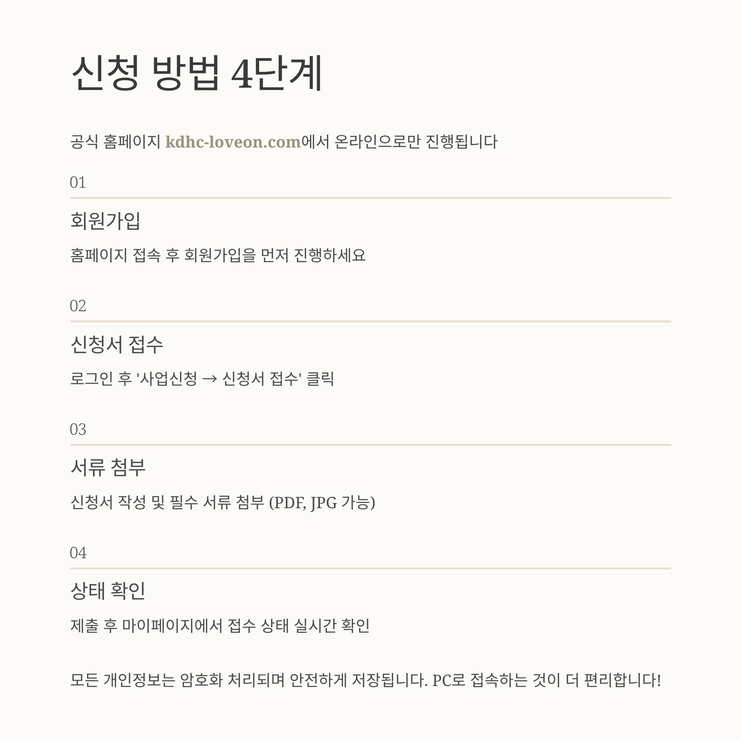 신청은 오직 **공식 홈페이지(kdhc-loveon.com)**를 통해 온라인으로만 진행됩니다. 절차는 다음 4단계로 매우 간단합니다.