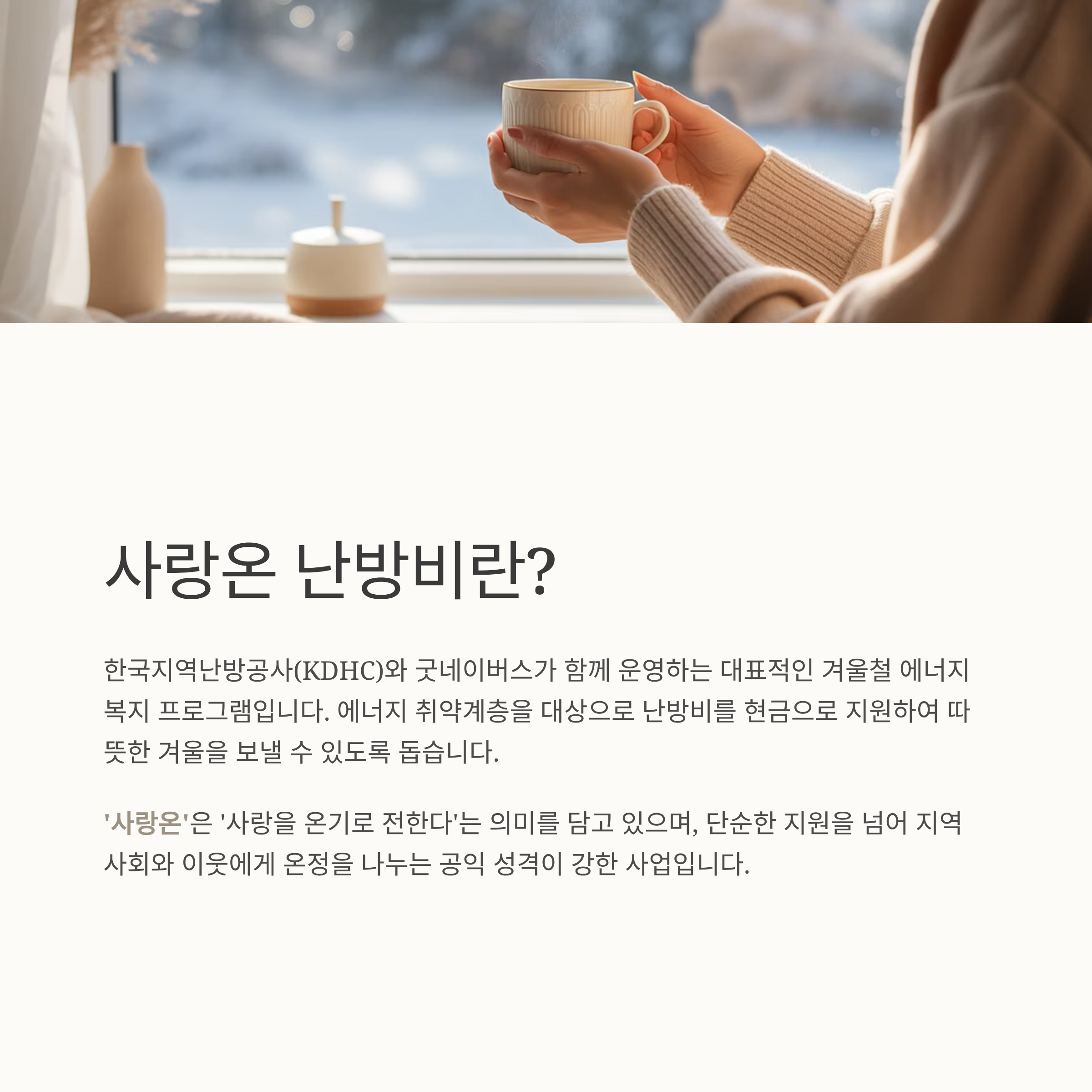 사랑온(溫) 난방비는 한국지역난방공사(KDHC)와 굿네이버스가 함께 운영하는 대표적인 겨울철 에너지 복지 프로그램입니다. 에너지 취약계층을 대상으로 난방비를 현금으로 지원하여 따뜻한 겨울을 보낼 수 있도록 돕는 목적을 가지고 있습니다. ‘사랑온’은 ‘사랑을 온기로 전한다’는 의미를 담고 있으며, 단순한 지원을 넘어 지역 사회와 이웃에게 온정을 나누는 공익 성격이 강한 사업입니다.