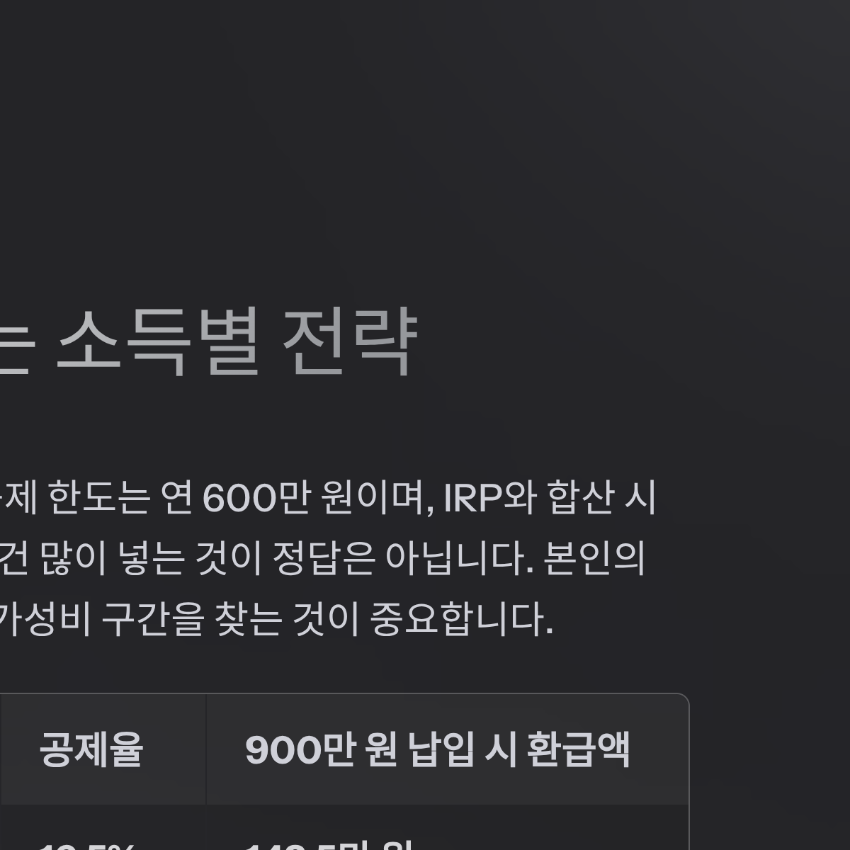 | 총급여(근로소득) | 종합소득금액 | 공제율 | 900만 원 납입 시 환급액 | 핵심 전략 |