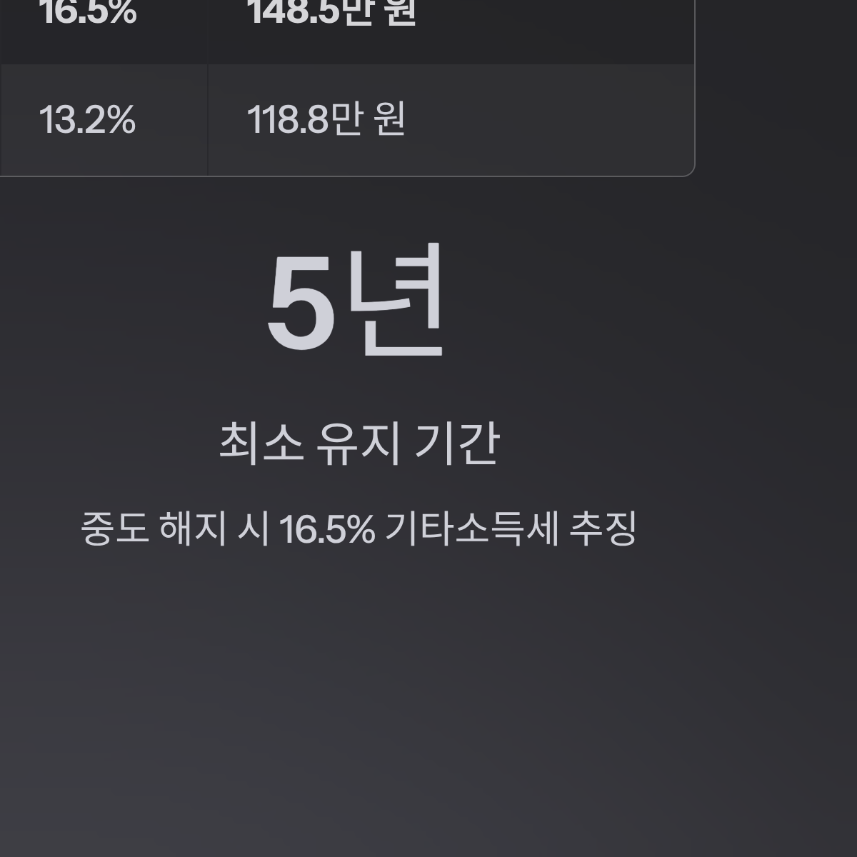 * 최소 유지 기간: 5년 이상 (중도 해지 시 16.5% 기타소득세 추징 주의)