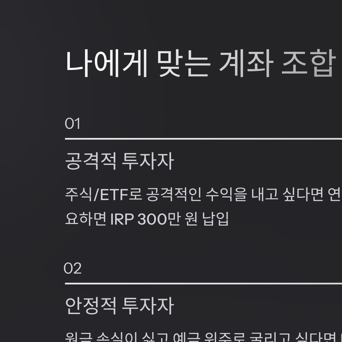 2. 나는 원금 손실이 싫고 예금 위주로 굴리고 싶다 → IRP에 900만 원 올인 (예금, ELB 등 다양한 원리금 보장 상품 활용 가능).