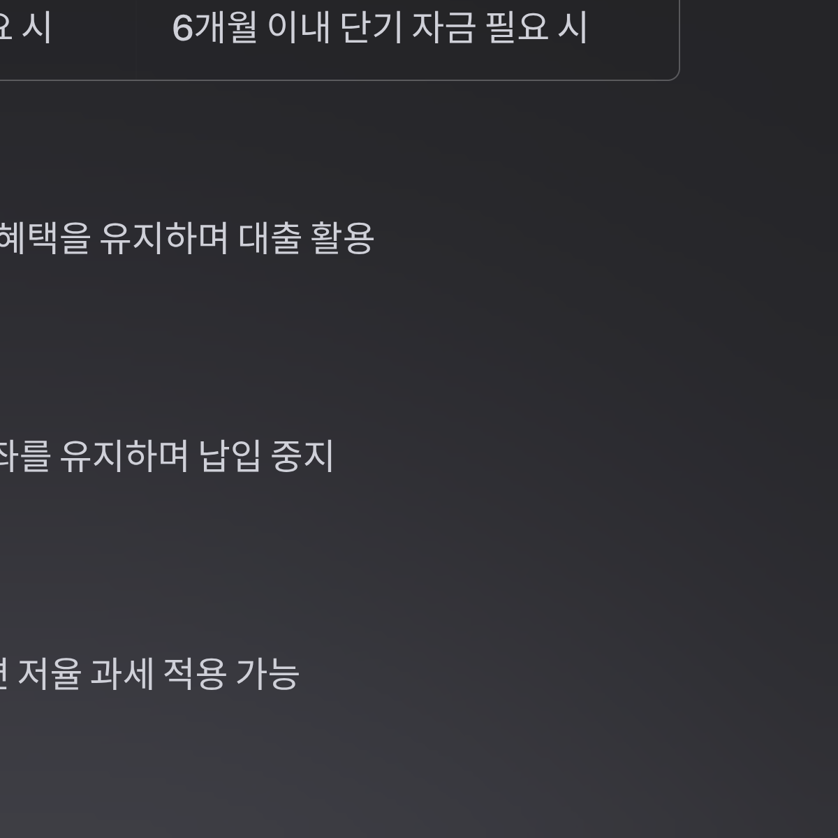 * 납입 중지는 불이익이 거의 없으므로, 경제 상황이 나빠졌을 때 가장 먼저 실행해야 할 조치입니다.