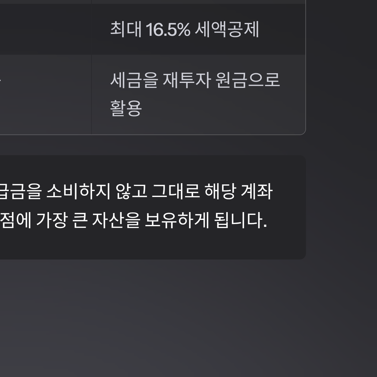 | 연말 환급 | 없음 | 최대 16.5% 세액공제 | 즉각적인 수익률 확보 |