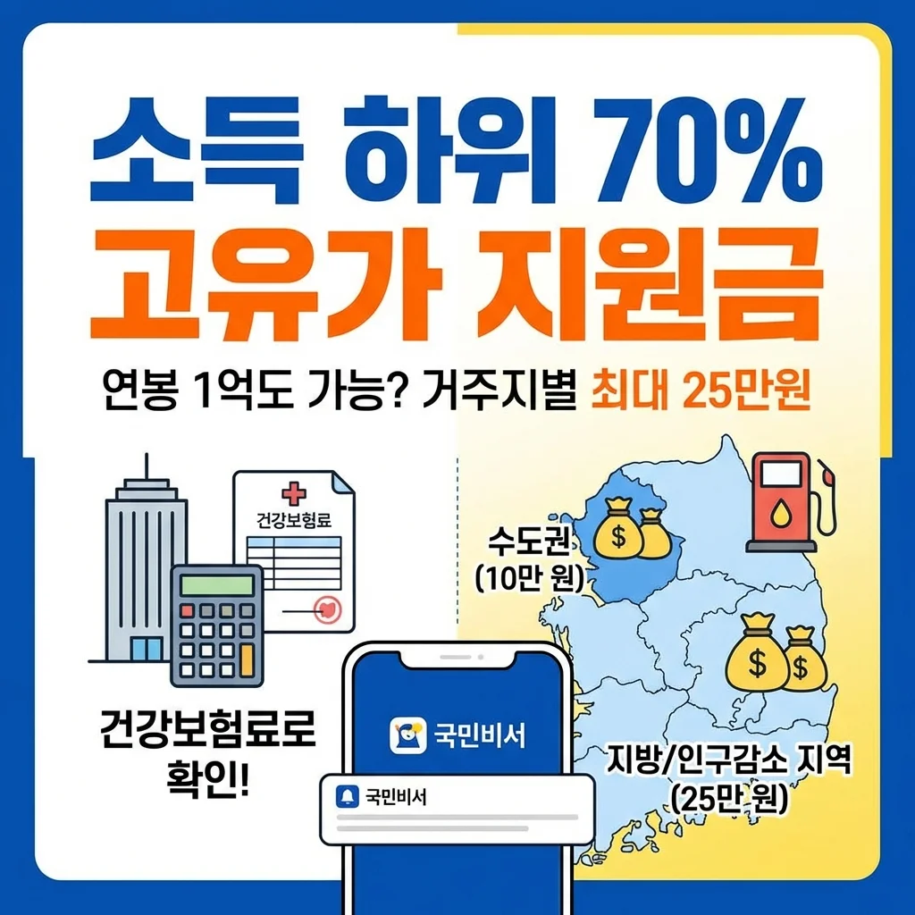 고유가 지원금 소식에 "나는 대상일까?" 고민하며 복잡한 뉴스만 뒤지고 계셨나요? 소득 하위 70%라는 모호한 기준 때문에 헷갈리는 분들을 위해 가구원수별 정확한 연봉 환산액과 거주지에 따라 최대 25만 원까지 달라지는 수령액을 완벽히 정리했습니다. 이 글을 통해 우리 집 건강보험료로 지원금 대상 여부를 단 1분 만에 판별하는 법을 확실히 알아가세요.