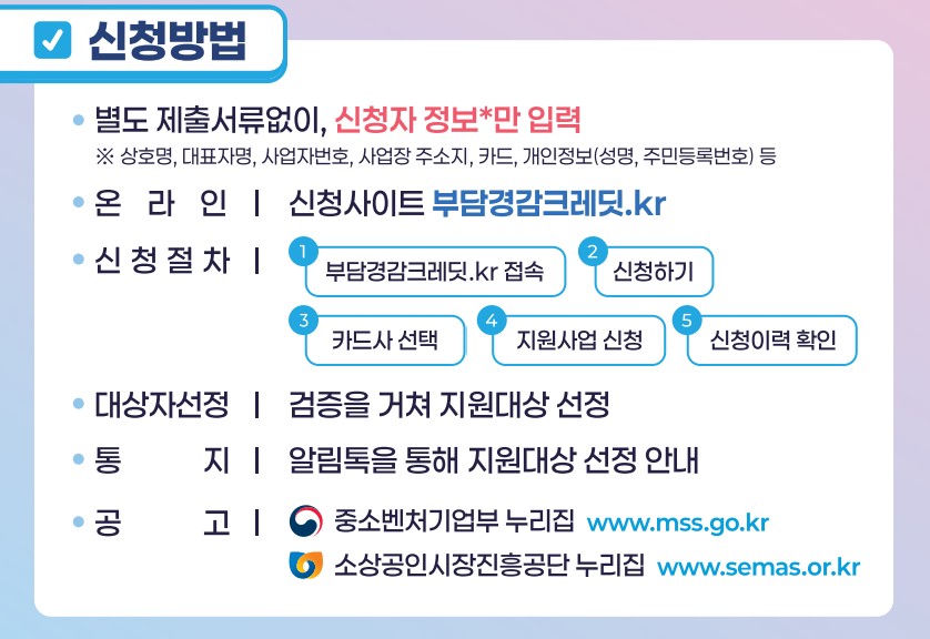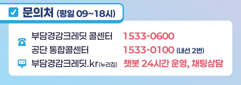 - 문의는 부담경감크레딧 콜센터(1533-0600) 또는 소상공인시장진흥공단 콜센터(1533-0100)로