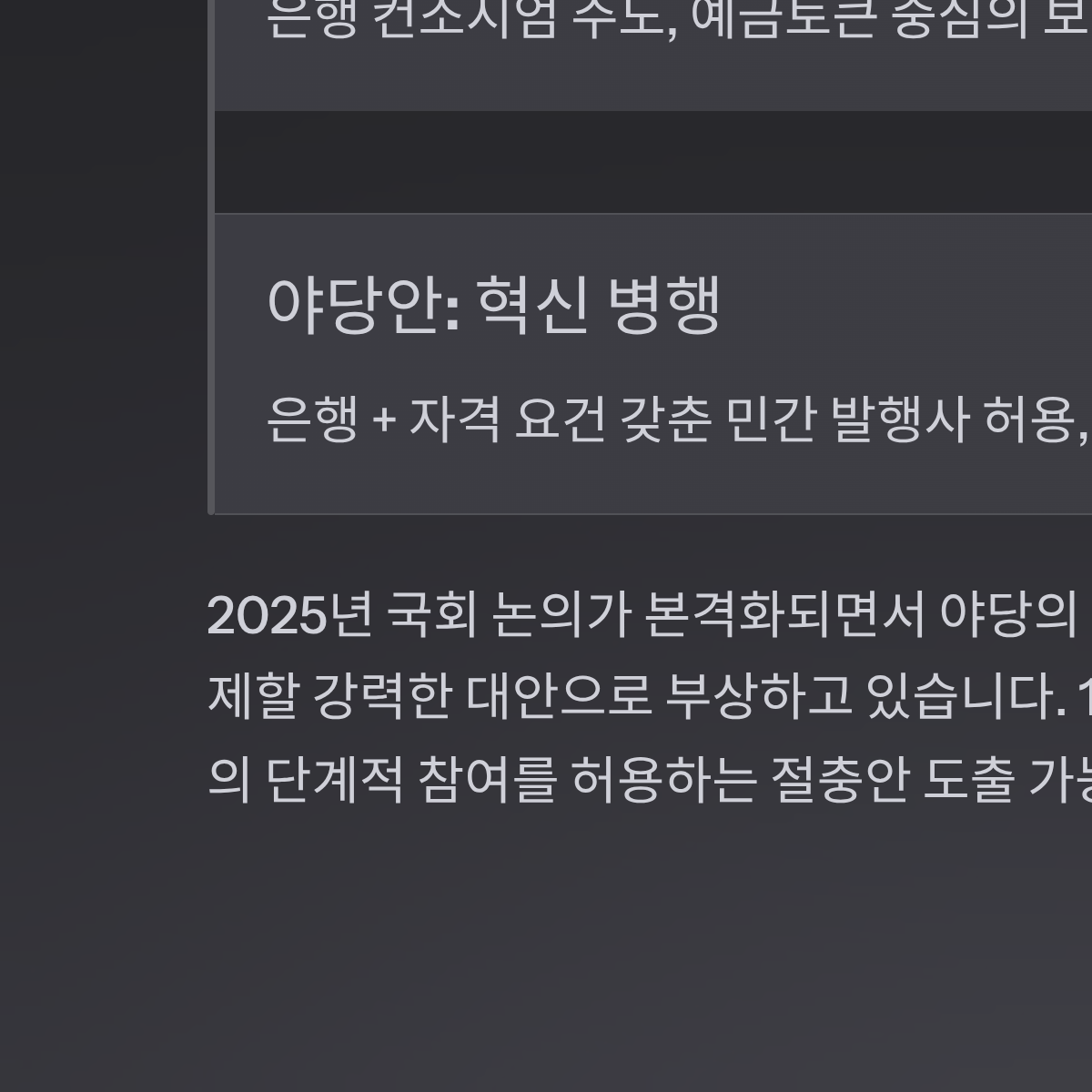- 야당안 (혁신 병행): 은행 + 자격 요건을 갖춘 민간 발행사 허용, 글로벌 호환성 강조