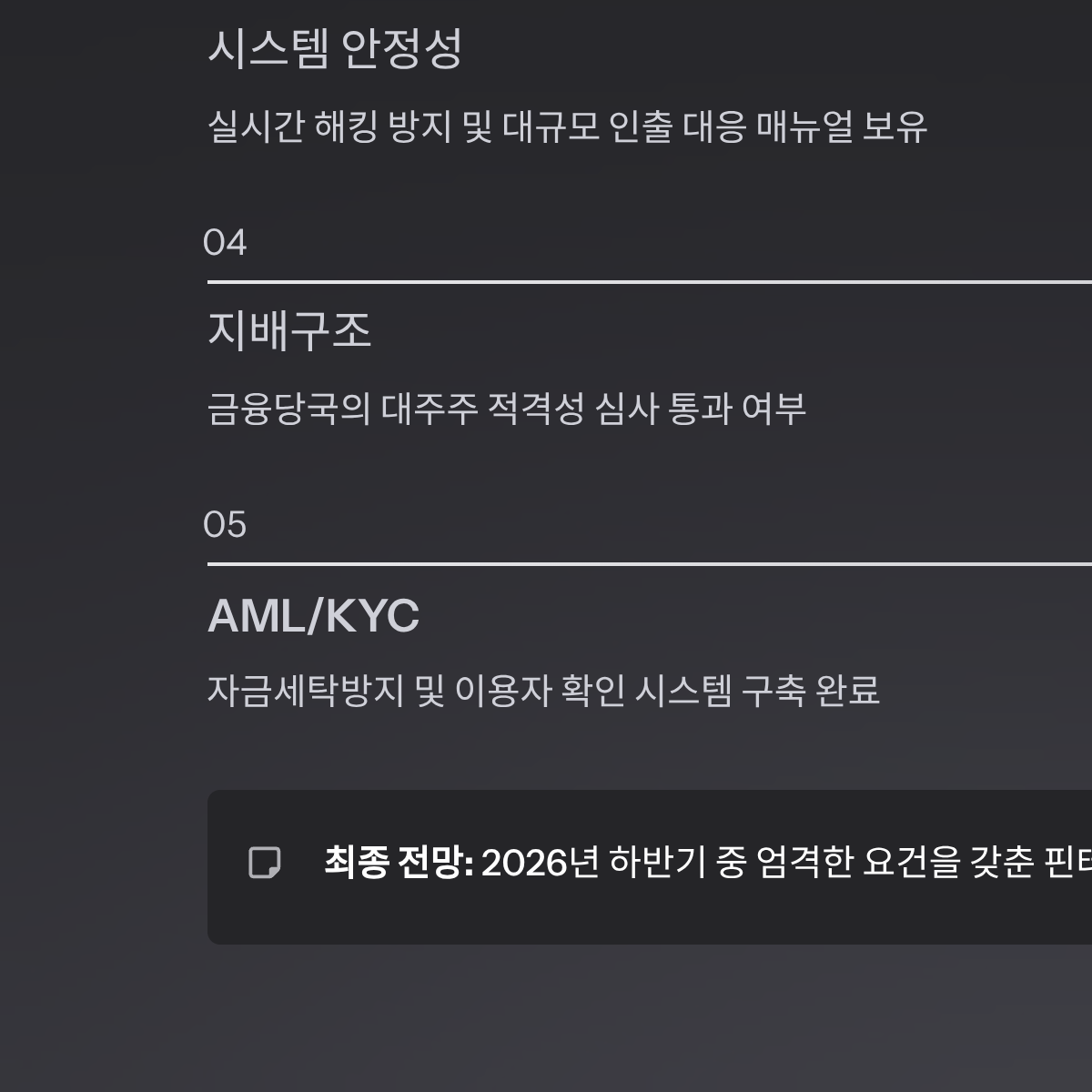 * 최종 전망: 2026년 하반기 중 '엄격한 요건을 갖춘 핀테크 기업'에 한해 제한적 허용이 유력함.