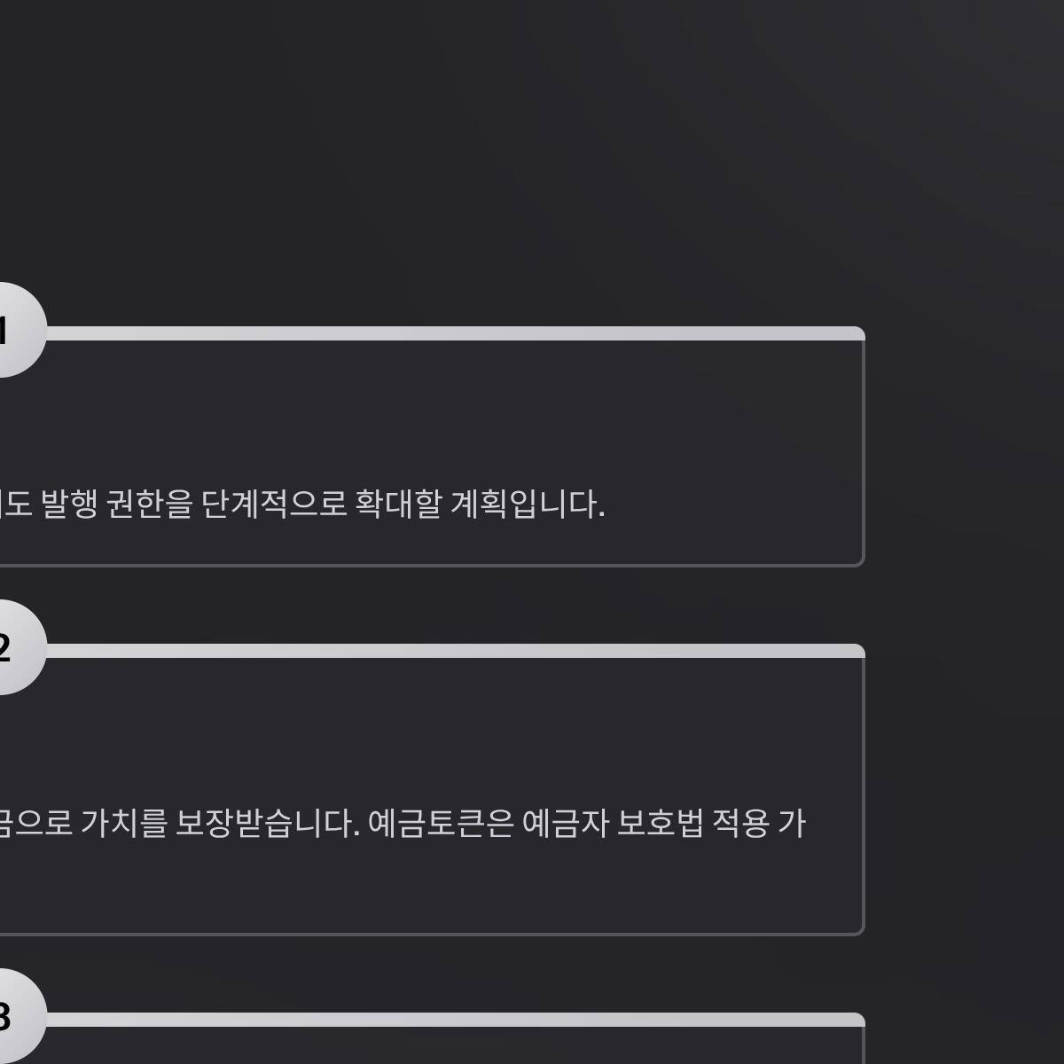 * 예금토큰 보호 한도: 기존 예금자 보호법 적용 시 인당 1억 원 (논의 중)