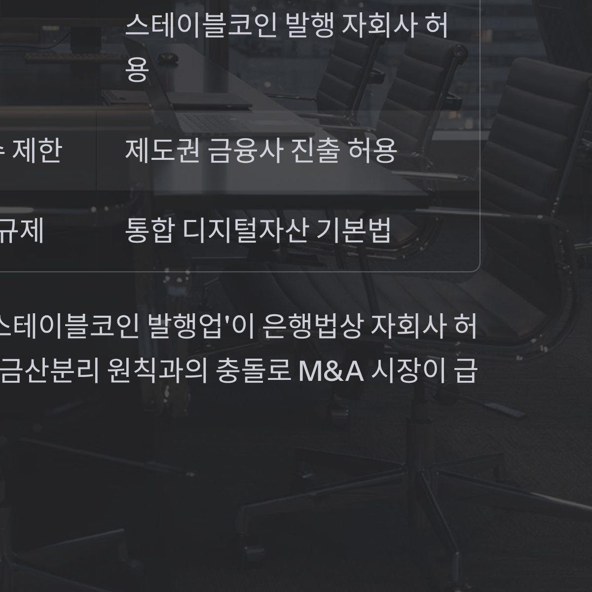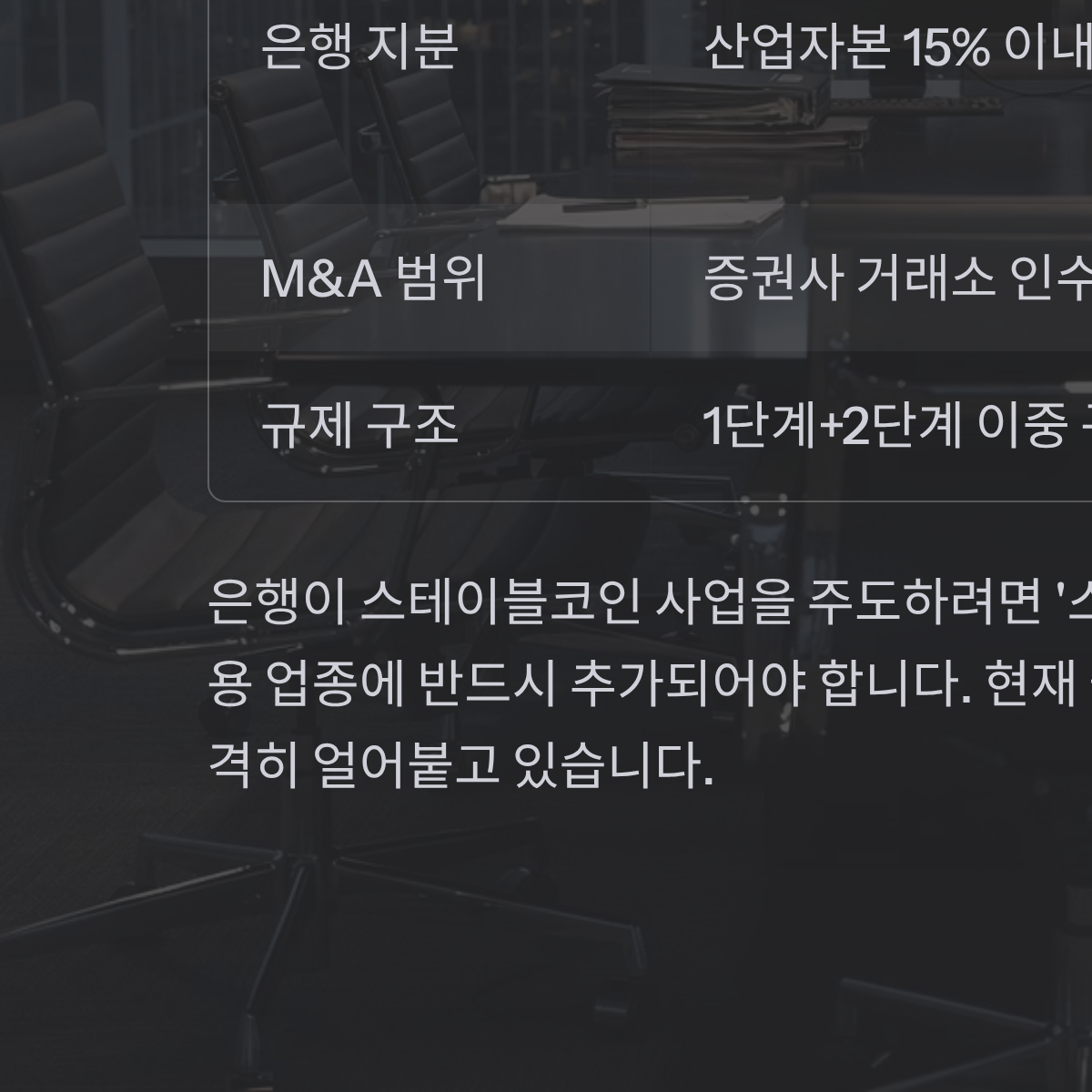 * 은행이 스테이블코인 사업을 주도하려면 '스테이블코인 발행업'이 은행법상 자회사 허용 업종에 반드시 추가되어야 합니다.