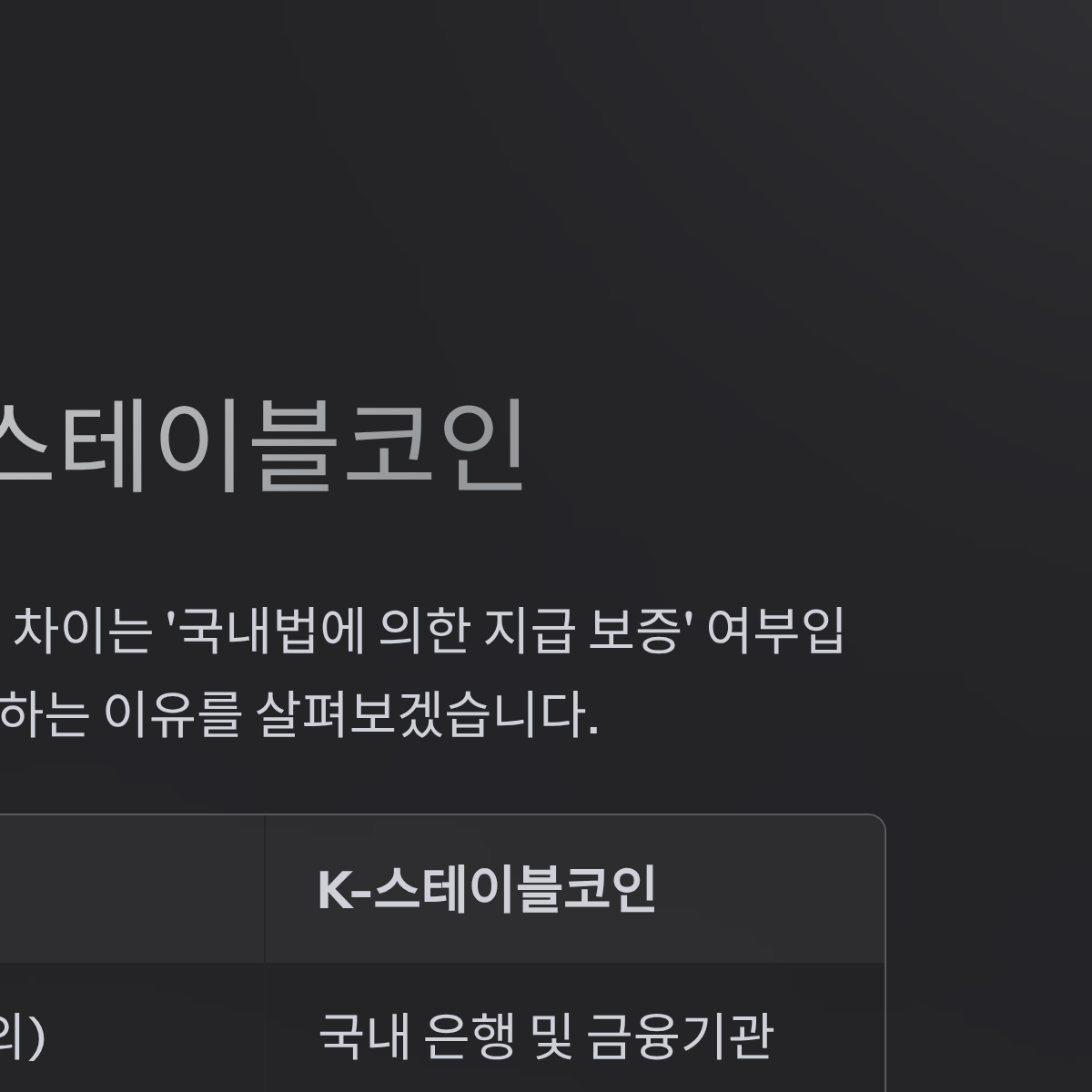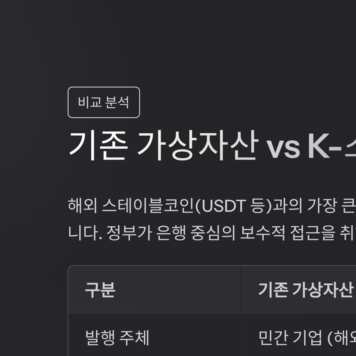 | 구분 | 기존 가상자산 (예: USDT) | 정부안 스테이블코인 (K-Stablecoin) | 핵심 판단 기준 |