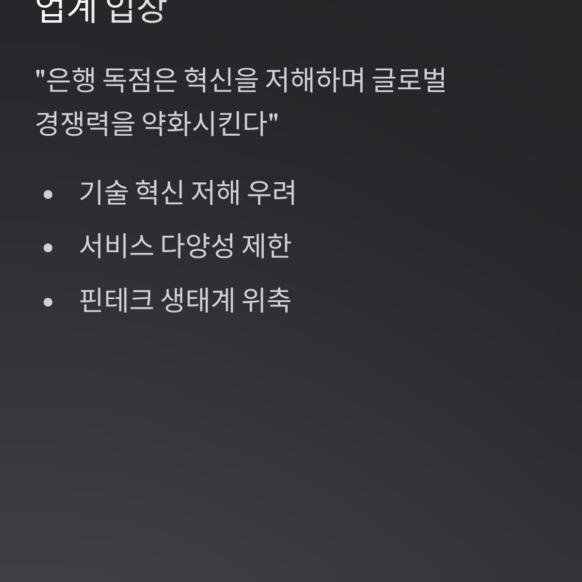 * 업계 입장: "은행 독점은 혁신을 저해하며, 글로벌 경쟁력을 약화시킨다."