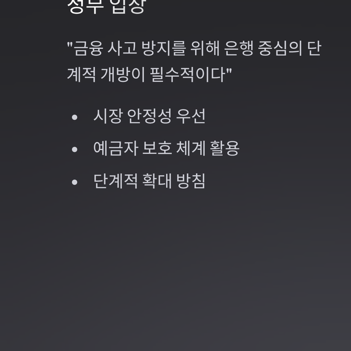 * 정부 입장: "금융 사고 방지를 위해 은행 중심의 단계적 개방이 필수적이다."