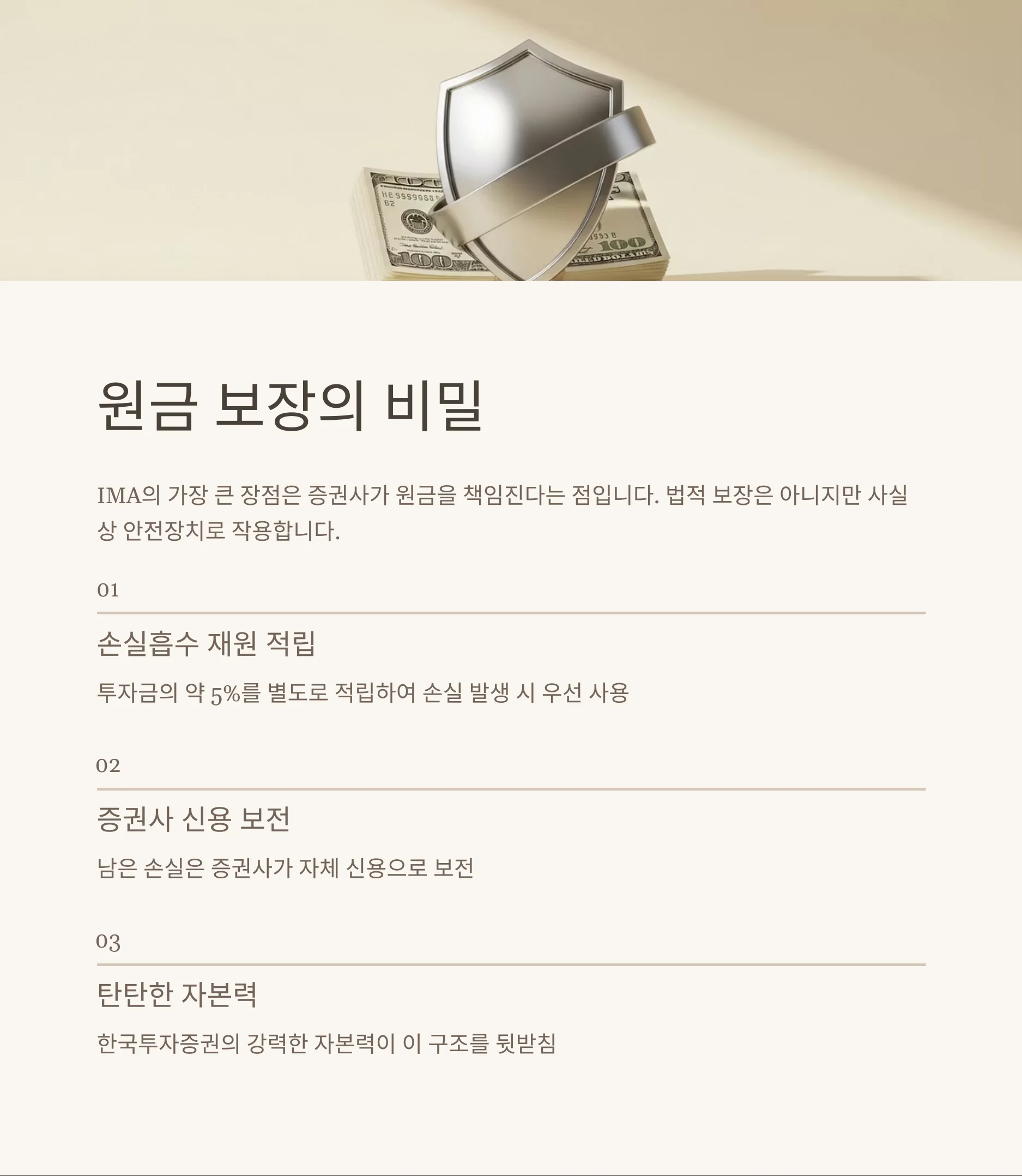 A: IMA 상품은 법적 원금 보장은 아니지만, 증권사가 사실상 원금을 책임지는 구조입니다. 따라서 안정적인 투자로 간주됩니다.