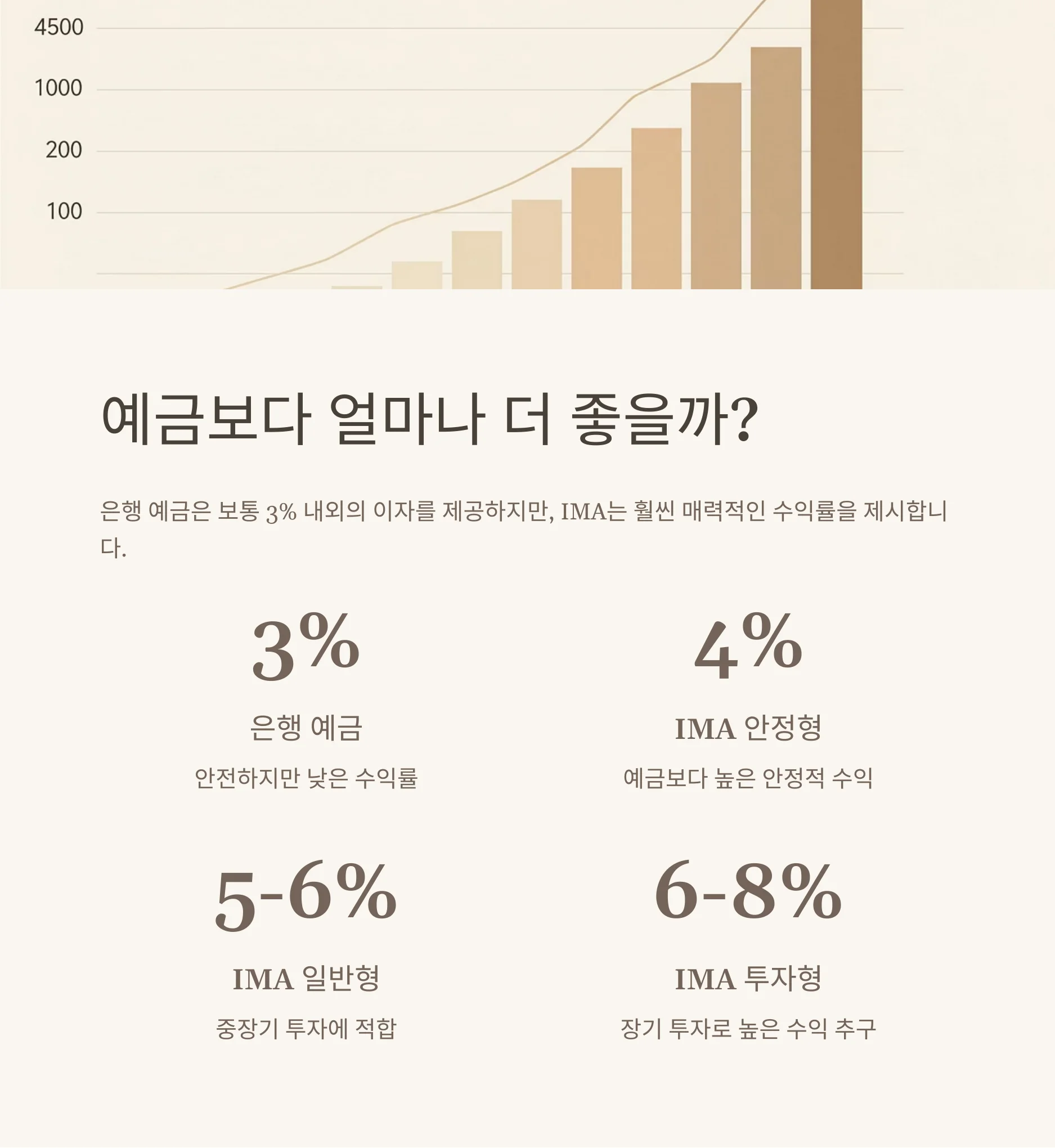 IMA는 은행 예금보다 높은 수익률과 안정성을 동시에 제공합니다. 은행 예금은 보통 3% 내외의 이자를 제공하며, 안전한 투자로 인식됩니다. 그러나 IMA는 안정형, 일반형, 투자형으로 나뉘어 각각 다른 수익률을 목표로 합니다. 안정형은 연 4% 안팎, 일반형은 연 5~6%, 투자형은 연 6~8%의 수익률을 목표로 합니다. 이러한 수익률은 예금보다 높은 수준이며, 특히 중장기 투자에 적합합니다. IMA의 안정성은 증권사가 고객의 원금을 보장하는 구조에서 비롯됩니다. 고객 투자금의 일부를 손실충당금으로 적립하여 손실 발생 시 원금을 보호하며, 증권사의 신용을 기반으로 원금을 보전합니다. 이는 예금자보호법의 적용을 받지 않지만, 초대형 증권사의 신용을 믿고 투자할 수 있는 이유입니다. 따라서, IMA는 예금보다 높은 수익을 추구하면서도 안정성을 유지하려는 투자자에게 적합한 선택이 될 수 있습니다.