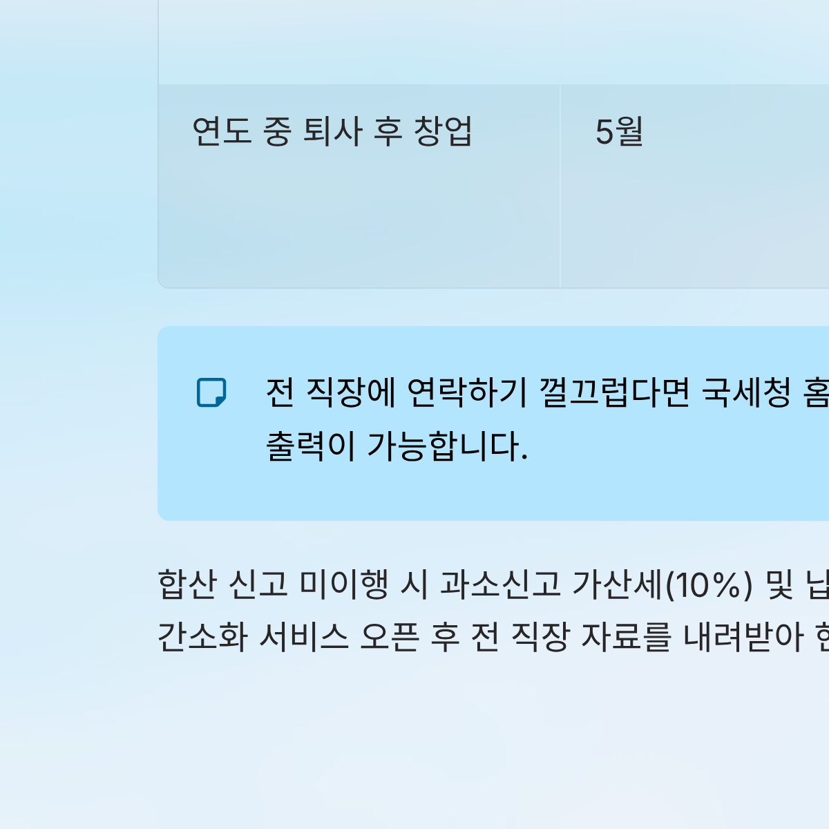 | 연도 중 퇴사 후 창업 | 5월 | 홈택스 직접 신고 | 근로소득과 사업소득을 합산하여 종합소득세 신고 |