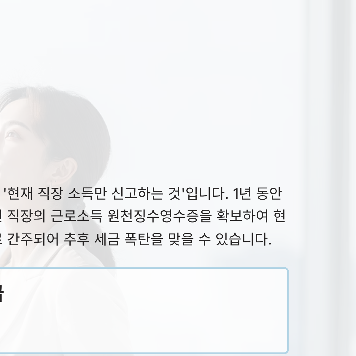 이직자나 중도 퇴사자가 가장 많이 실수하는 것이 '현재 직장 소득만 신고하는 것'입니다. 제가 예전에 이직했을 때도 전 직장 자료를 챙기지 않아 5월에 가산세까지 물며 고생한 적이 있습니다. 1년 동안 두 군데 이상의 직장에서 근무했다면, 반드시 이전 직장의 근로소득 원천징수영수증(Withholding Tax Receipt)을 확보하여 현 직장에 제출해야 합니다. 만약 이를 놓치면 이중 근로로 간주되어 추후 '세금 폭탄'을 맞을 수 있습니다.