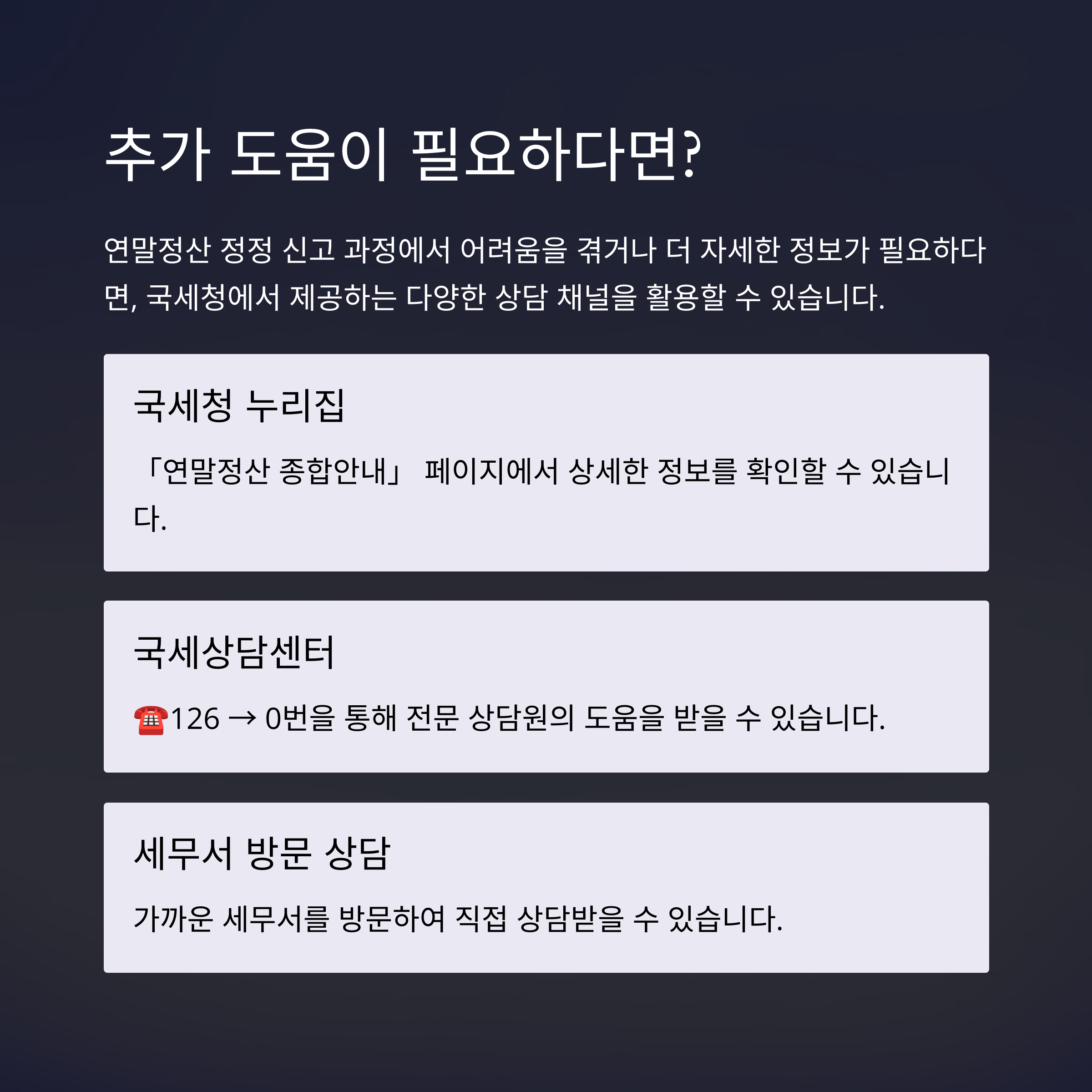 더 궁금한 사항이 있다면 국세청 누리집의 「연말정산 종합안내」를 참고하거나 국세상담센터(☎126 → 0)에 문의할 수 있습니다.