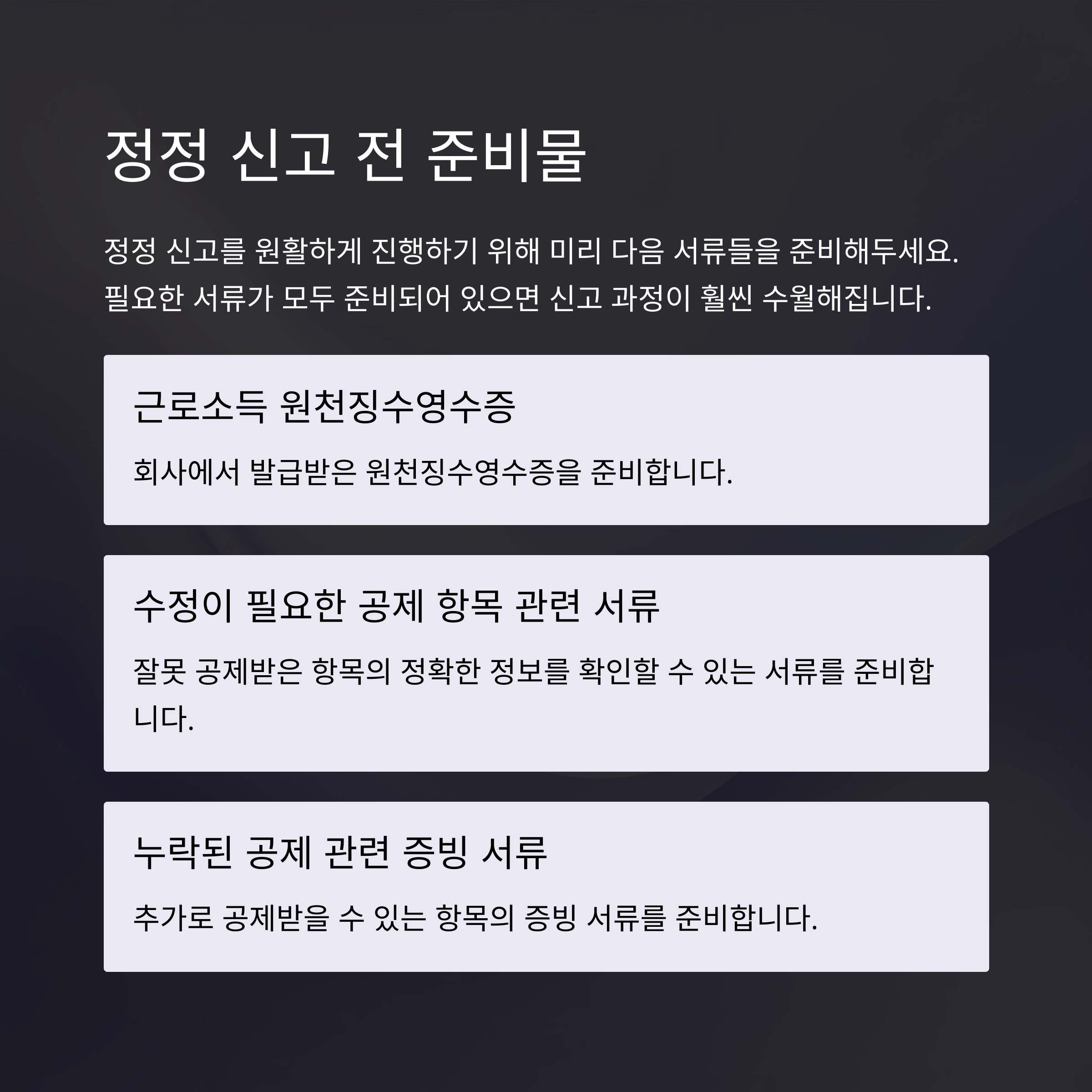 정정 신고 시에는 미리 다음 정보들을 준비하시면 좋습니다: